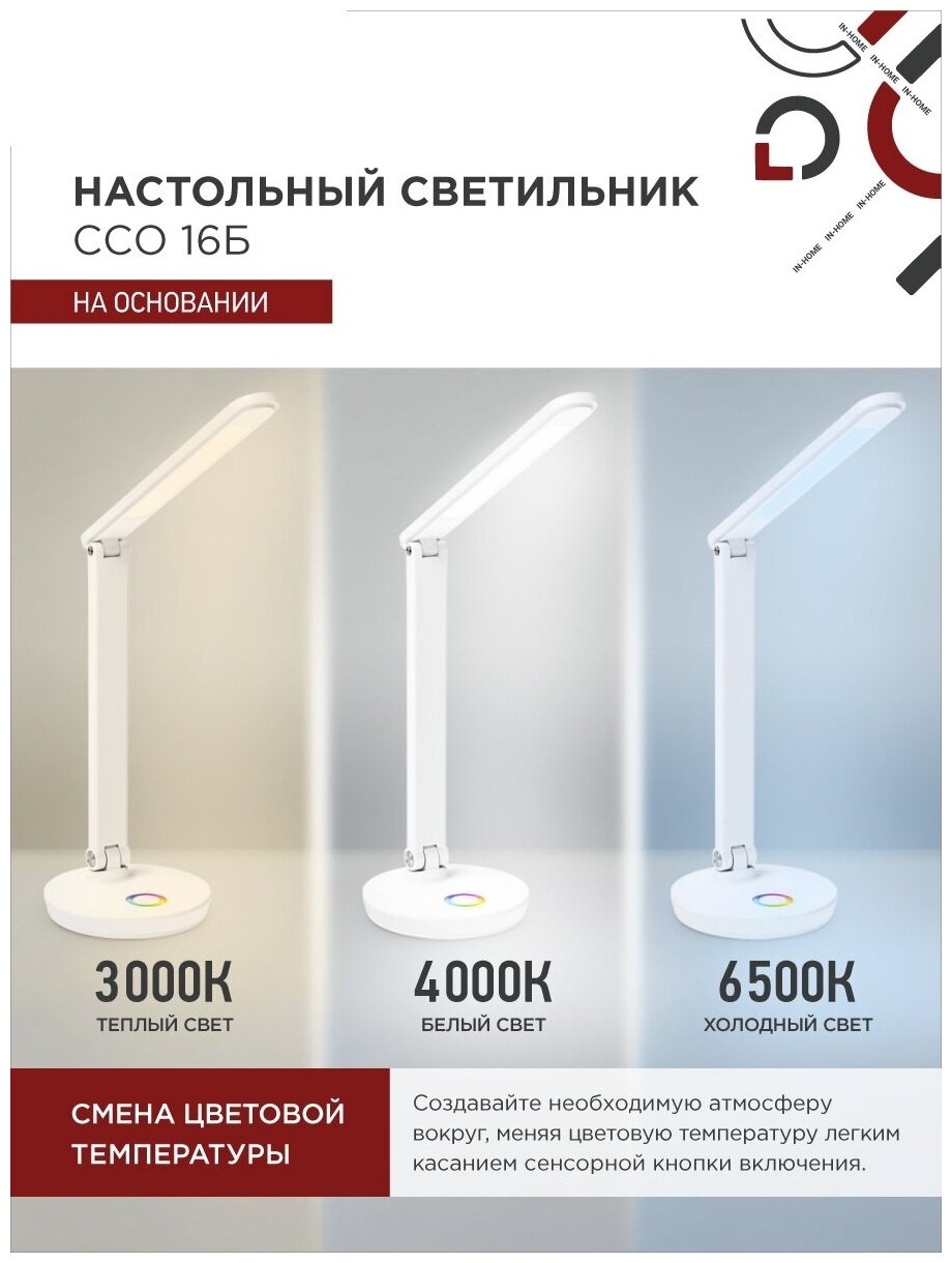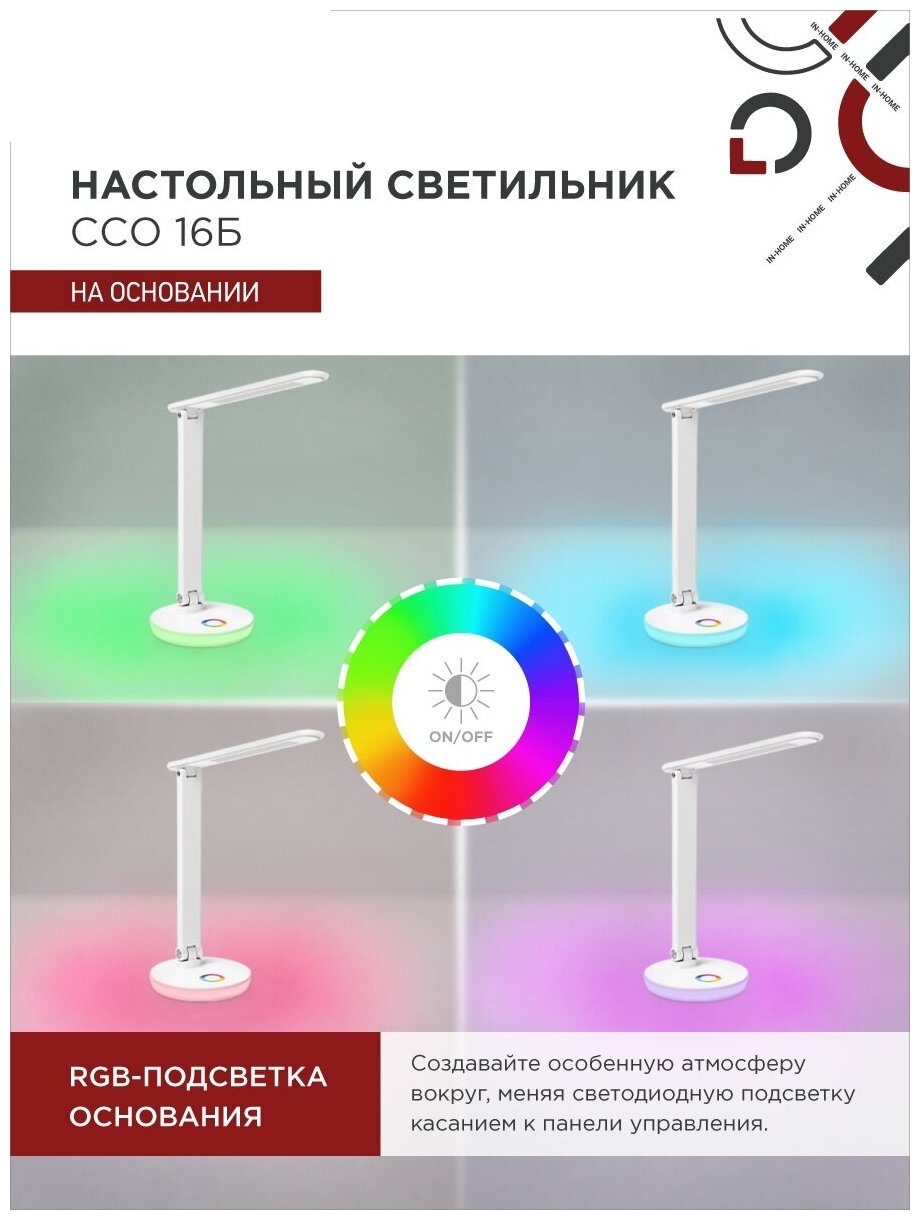 Купить Светильник настольный светодиодный PLUS ССО-16Б 12Вт 600Лм RGB, сенсор, USB разъем, адаптер белый IN HOME 4690612037967