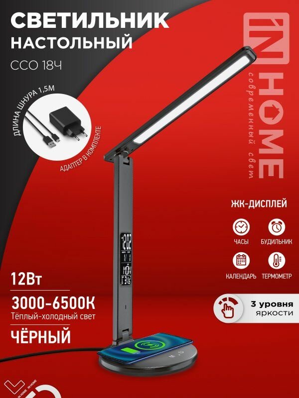 Купить Светильник настольный светодиодный PLUS ССО-18Ч 12Вт 3000-6500К 600Лм сенсор, с беспроводной зарядкой, часы, температура, с адаптером черный IN HOME
