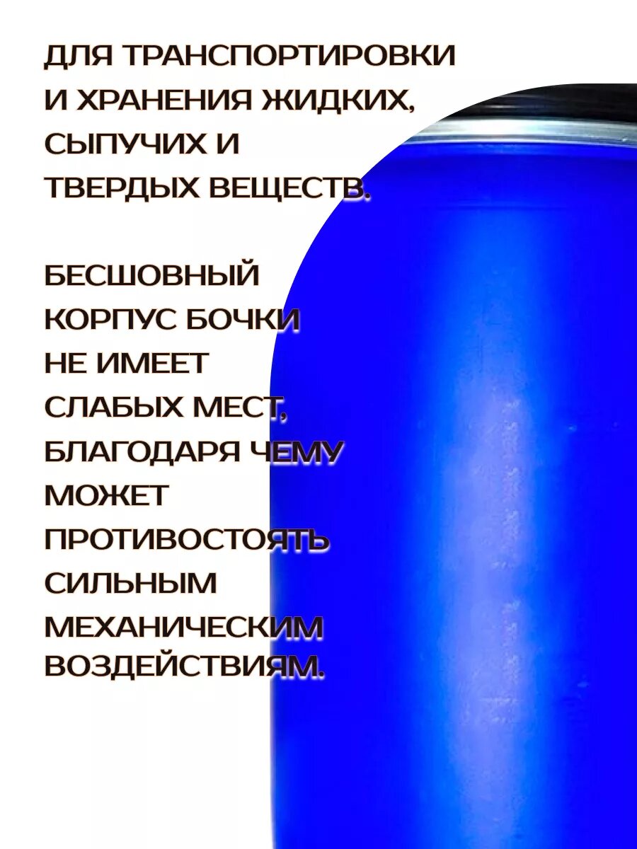 Бочка пластиковая 227 л, диаметр горловины 47.6 см; для хранения различных жидкостей. Емкость незаменима в подсобном хозяйстве, строительстве, на даче, на приусадебном участке интересное: