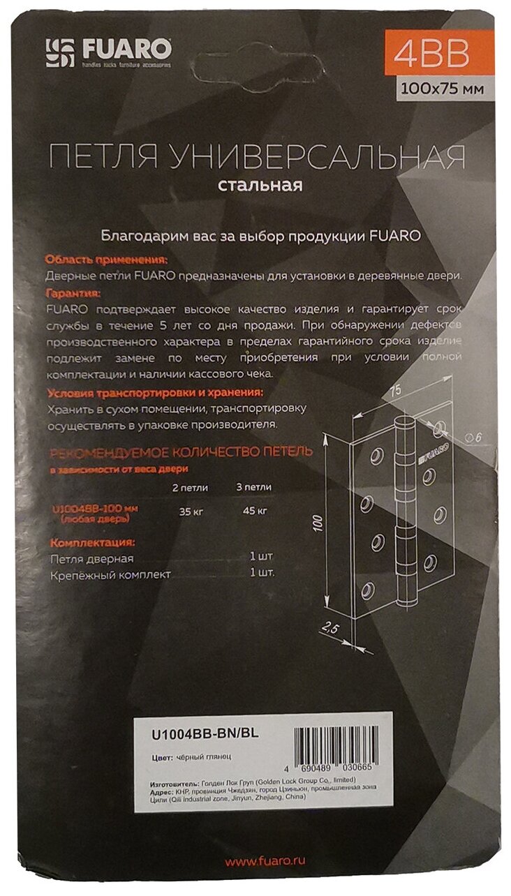 Купить Петля универсальная Fuaro IN4400U-BL BN (4BB/BL 100x75x2,5), чёрный глянец, в блистере (комплект 12 штук)