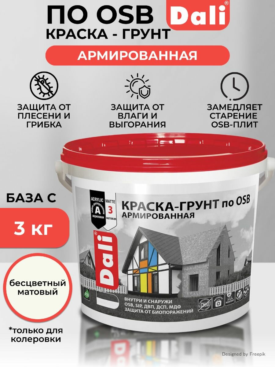 Краска-грунт по OSB Dali , армированная, матовая, база C, бесцветная, 3 кг