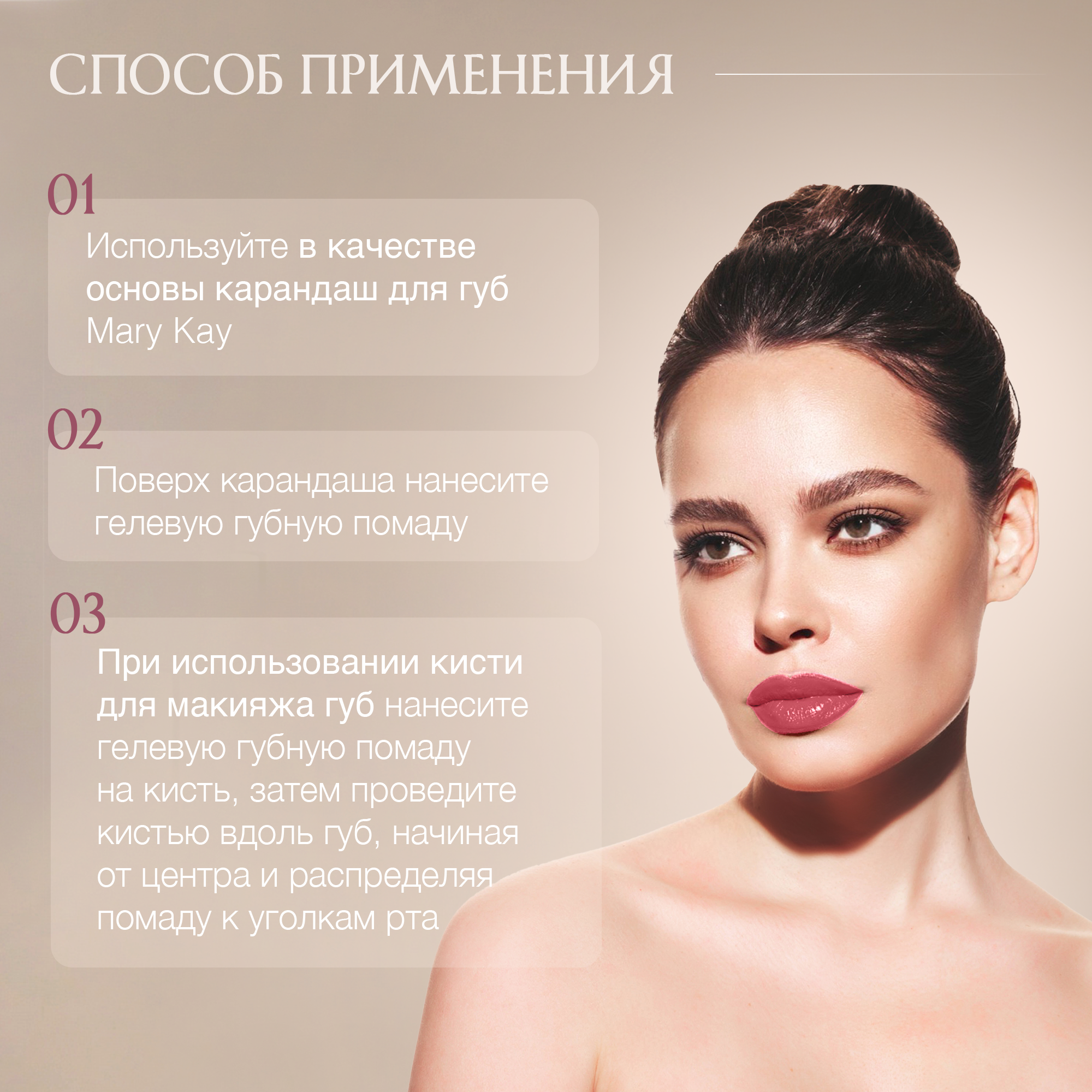 | Способ применения | при использовании кисти для макияжа губ нанесите гелевую губную помаду на кисть, затем проведите кистью вдоль губ, начиная от центра и распределяя помаду к уголкам рта. Нанесите нужное количество раз, чтобы добиться желаемого эффекта |