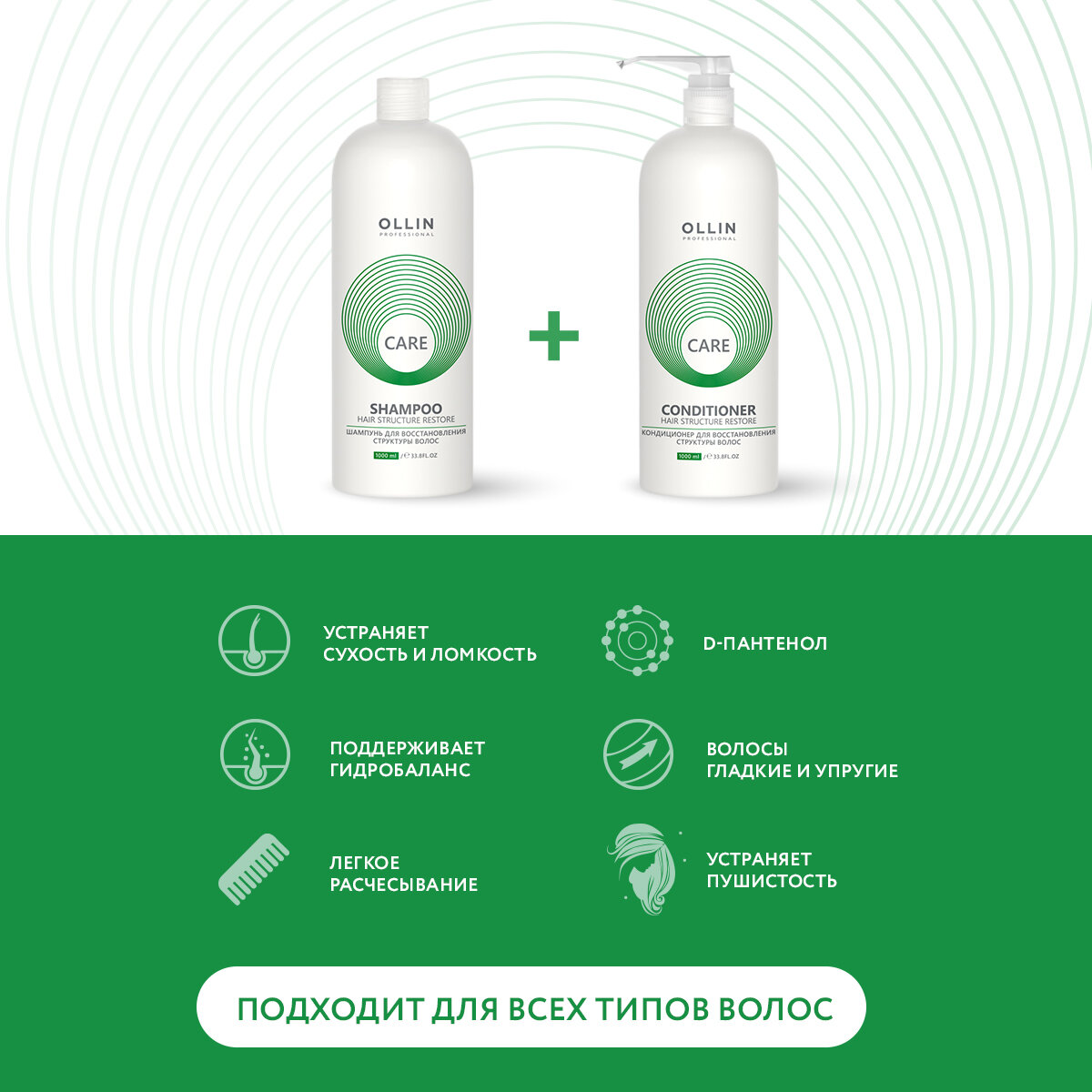 OLLIN Professional набор для восстановления структуры волос CARE RESTORE: шампунь, 1000 мл + кондиционер, 1000 мл + дозатор