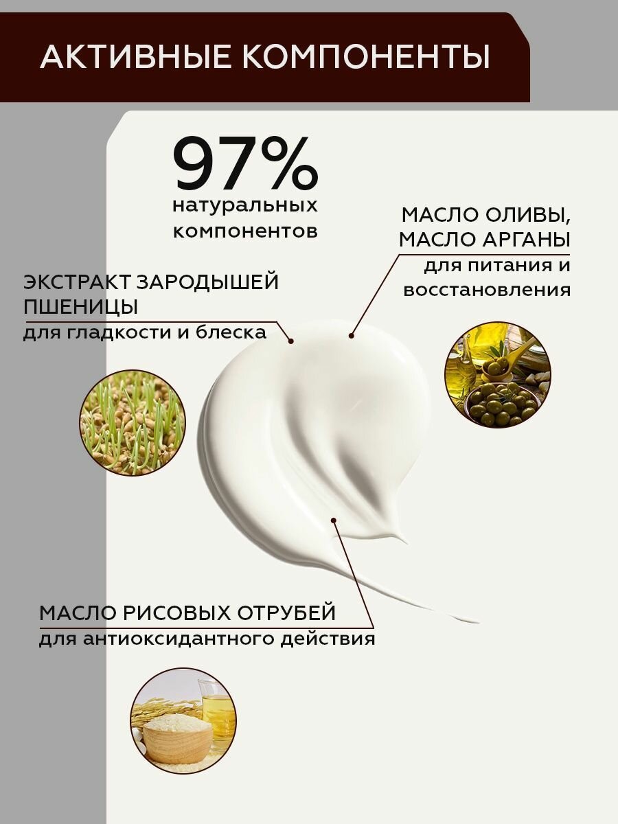 | Состав | aqua (water), cetearyl alcohol, cetrimonium chloride, myristyl alcohol, cetyl alcohol, stearyl alcohol, dipalmitoylethyl hydroxyethylmonium methosulfate, behenamidopropyl dimethylamine, argania spinosa kernel oil, oryza sativa (rice) bran oil, triticum vulgare (wheat) seed extract, olea europaea (olive) fruit oil, hydrogenated vegetable oil, hydrolyzed vegetable protein, butyrospermum parkii (shea) butter, glycerin, tocopherol, parfum (fragrance), benzyl alcohol, glyceryl laurate, lactic acid, citric acid, sodium benzoate, potassium sorbate |