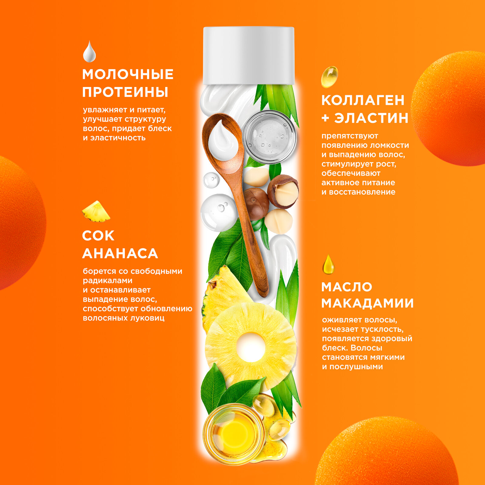 | Активный ингредиент | аминокислоты / аргинин / биотин / витамин A / витамин C / витамин E / витамины группы B / керамиды / кератин / кокосовое молоко / коллаген / пантенол / протеины / цетримониум хлорид / эластин |