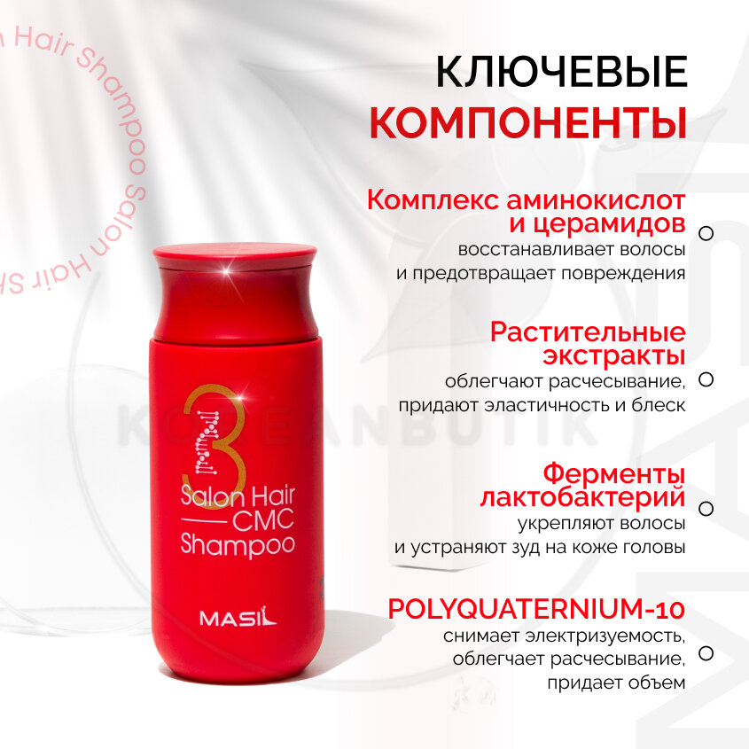 | Дополнительная информация | рекомендуется использовать шампунь в паре с восстанавливающей маской MASIL 8 Second |
