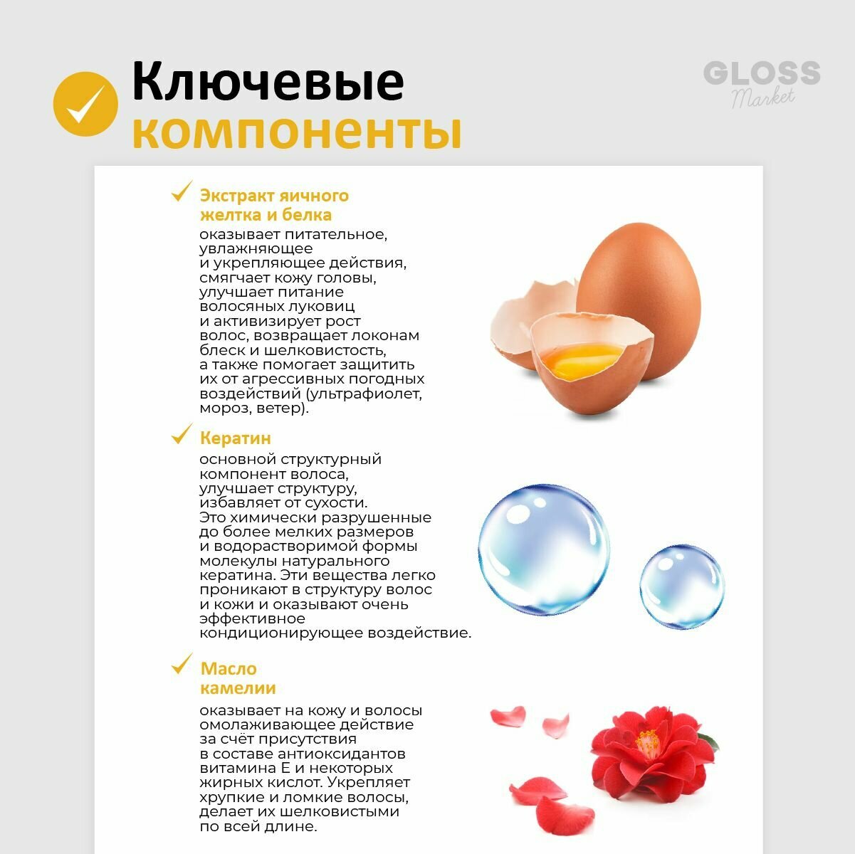 | Эффект | активация роста / восстановление / глубокая очистка / облегчение расчесывания / очищение / питание / придание блеска / придание мягкости / против выпадения / против перхоти / против секущихся кончиков / разглаживание / увлажнение / укрепление |