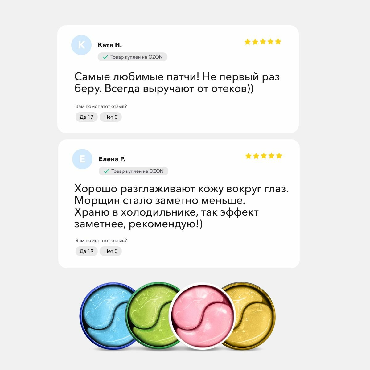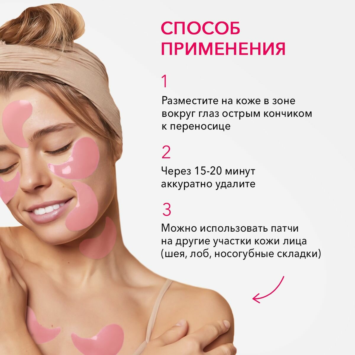 | Способ применения | для охлаждающего эффекта патчи лучше положить в холодильник перед использованием. Лопаточкой достать патчи из контейнера, разместить на очищенной коже под глазами острым кончиком к переносице, добиться плотного прилегания, держать 15-30 минут, затем патчи аккуратно удалить, остатки средства мягко втереть в кожу, не смывая. Рекомендованный курс – 30 дней. Патчи можно использовать и на других участках лица |