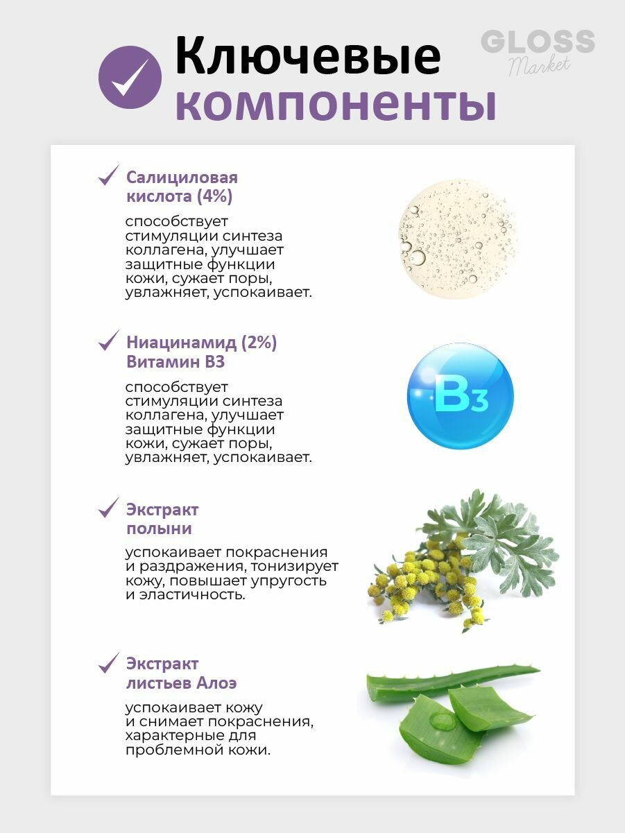 | Активный ингредиент | AHA-кислоты / ВНА-кислоты / азелаиновая кислота / аллантоин / витамин A (ретинол) / витамин B3 (ниацинамид) / витамины / гиалуроновая кислота / пантенол (провитамин B5) / пептиды / салициловая кислота / сок алоэ |