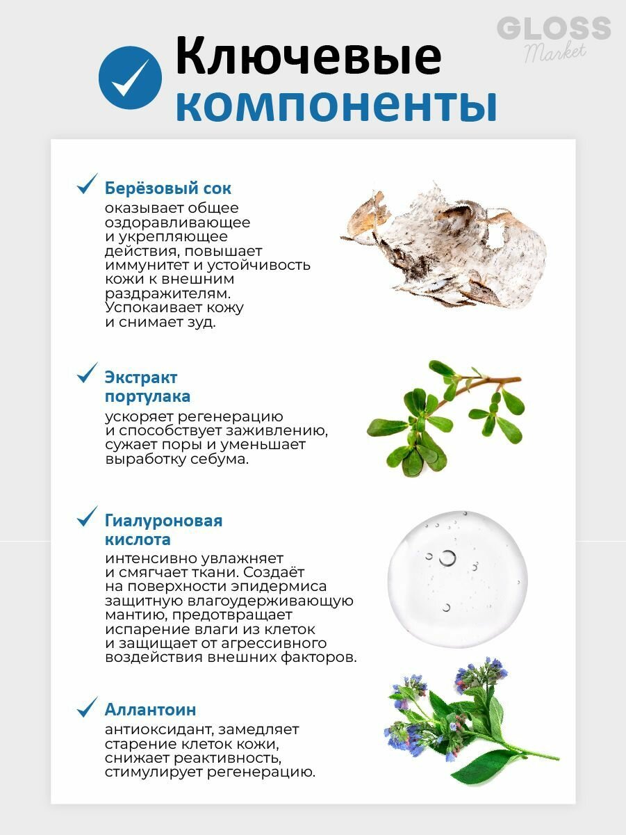| Активные ингредиенты | аденозин, аллантоин, витамин Е, гиалуроновая кислота, глицерин, комплекс витаминов, ниацинамид, пантенол, пептиды, сок алоэ, цинк, экстракт ромашки |