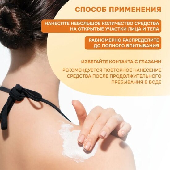 | Способ применения | нанесите небольшое количество средства на открытые участки тела и равномерно распределите до полного впитывания. После продолжительного пребывания в воде для поддержания солнцезащитного эффекта рекомендуется повторное нанесение средства. Избегайте контакта с глазами |