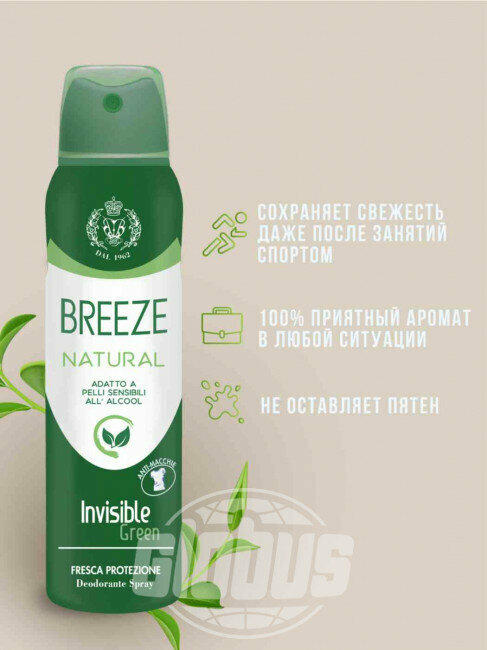 | Дополнительная информация | Наша торговая марка Breeze является лидером в сегменте парфюмерии и дезодорантов на Итальянском рынке за счет разнообразия ароматов и продолжительности действия продукта. Аэрозольный дезодорант спрей Acqua Унисекс обеспечит защиту от неприятного запаха в течении 48 часов, благодаря новой молекуле в составе. Формула дезодоранта не содержит солей алюминия, поэтому подходит для всех типов кожи, не оставляет белых пятен на одежде. Наш дезодорант спрей не закупоривает поры, что позволяет коже дышать. Дерматологически протестирован. ПАРФЮМ : Верхние ноты: морские, цитрусовые, свежие. Ноты сердца: ландыш, жасмин. Базовые ноты: тальк, мускус. |