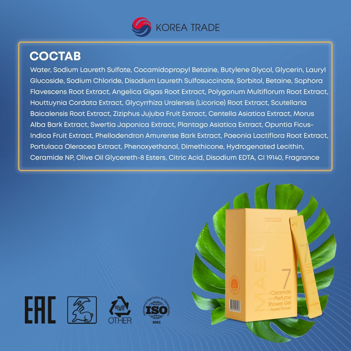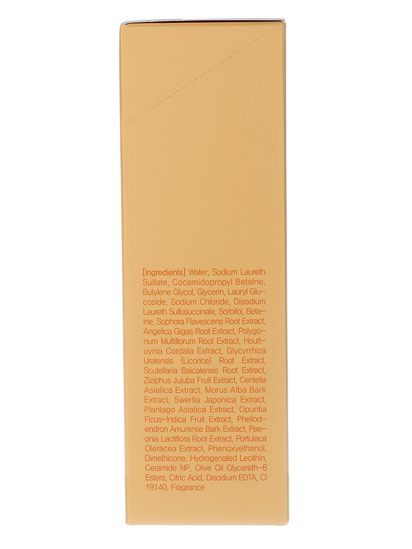 | Состав | Water, Sodium Laureth Sulfate, Cocamidopropyl Betaine, Butylene Glycol, Glycerin, Lauryl Glucoside, Sodium Chloride, Disodium Laureth Sulfosuccinate, Sorbitol, Betaine, Sophora Flavescens Root Extract, Angelica Gigas Root Extract, Polygonum Multiflorum Root Extract, Houttuynia Cordata Extract, lycyrrhiza Uralensis (Licorice) Root Extract, Scutellaria Baicalensis Root Extract, Ziziphus Jujuba Fruit Extract, Centella Asiatica Extract, Morus Alba Bark Extract, Swertia Japonica Extract, Plantago Asiatica Extract, Opuntia Ficus-Indica Fruit Extract, Phellodendron Amurense Bark Extract, Paeonia Lactiflora Root Extract, Portulaca Oleracea Extract, Phenoxyethanol, Dimethicone, Hydrogenated Lecithin, Ceramide NP, Olive Oil Glycereth-8 Esters, Citric Acid, Disodium EDTA, CI 19140, Benzyl Salicylate, Linalool, Citronellol, Hexyl Cinnamal, Fragrance. |