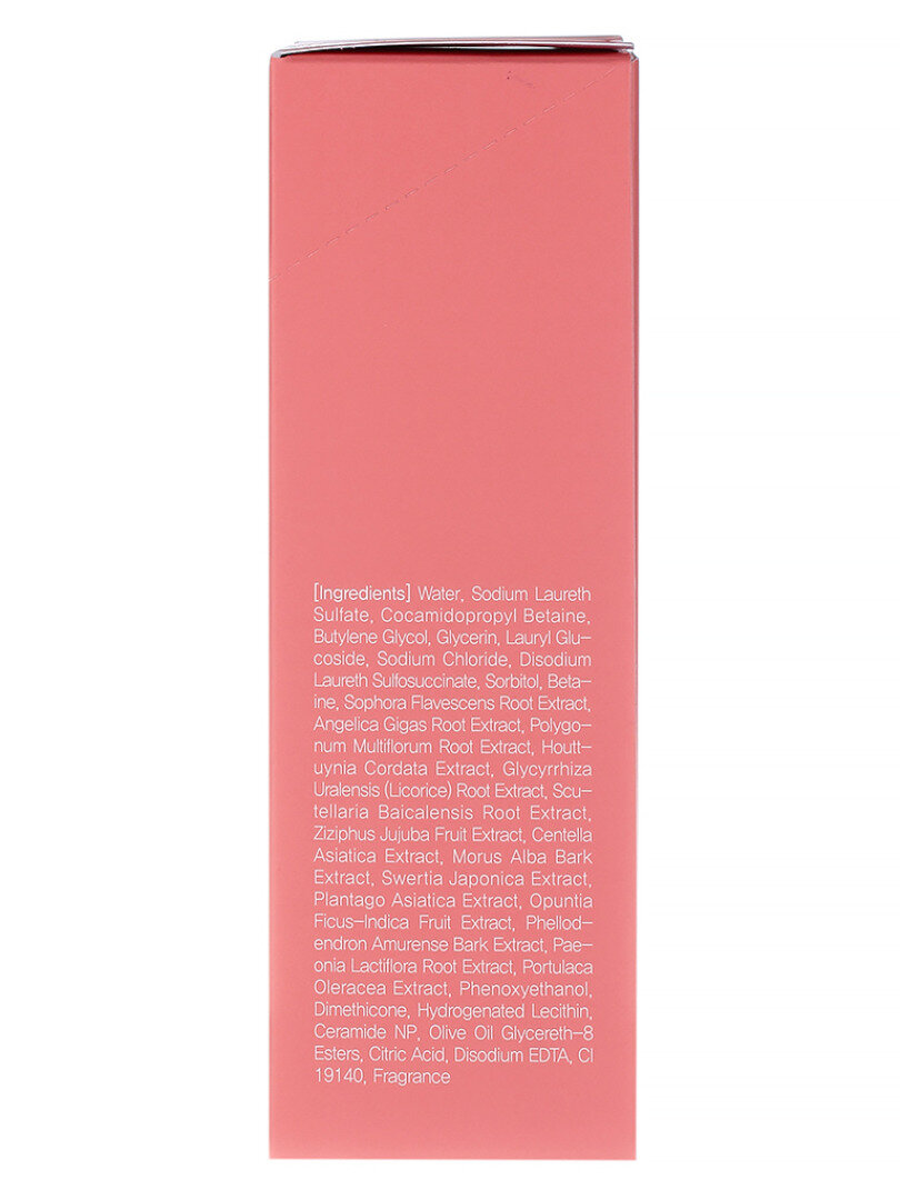 | Состав | Water, Sodium Laureth Sulfate, Cocamidopropyl Betaine, Butylene Glycol, Glycerin, Lauryl Glucoside, Sodium Chloride, Disodium Laureth Sulfosuccinate, Sorbitol, Betaine, Sophora Flavescens Root Extract, Angelica Gigas Root Extract, Polygonum Multiflorum Root Extract, Houttuynia Cordata Extract, lycyrrhiza Uralensis (Licorice) Root Extract, Scutellaria Baicalensis Root Extract, Ziziphus Jujuba Fruit Extract, Centella Asiatica Extract, Morus Alba Bark Extract, Swertia Japonica Extract, Plantago Asiatica Extract, Opuntia Ficus-Indica Fruit Extract, Phellodendron Amurense Bark Extract, Paeonia Lactiflora Root Extract, Portulaca Oleracea Extract, Phenoxyethanol, Dimethicone, Hydrogenated Lecithin, Ceramide NP, Olive Oil Glycereth-8 Esters, Citric Acid, Disodium EDTA, CI 19140, Benzyl Salicylate, Linalool, Citronellol, Hexyl Cinnamal, Fragrance. |