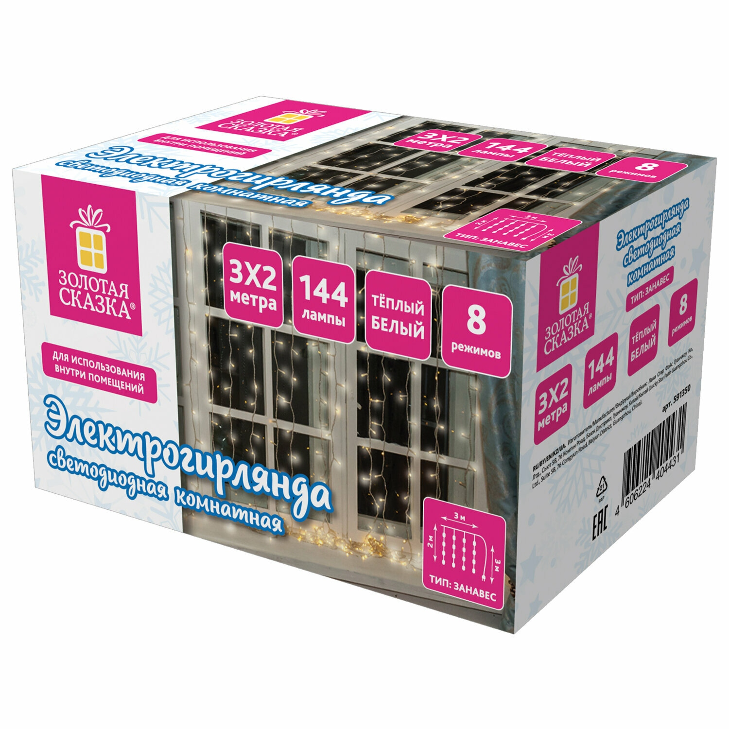 Купить Гирлянда светодиодная занавес комнатная Штора, электрическая от сети, для дома, новогодняя 3х2м, 144LED, теплый белый, 220V, Золотая Сказка, 591350