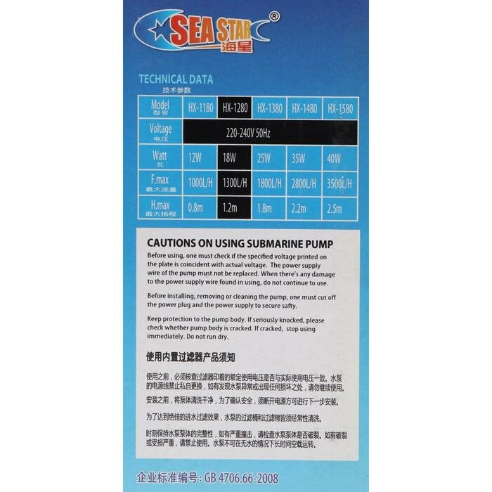 Помпа аквариумная Sea Star HX-1280, 18 Вт, высота подъема 1.2 м, 1300 л/ч
