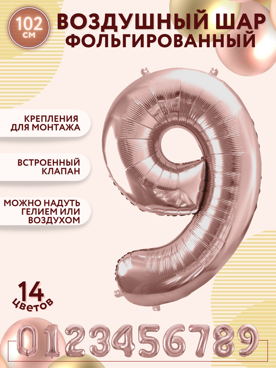 Купить Фольгированный воздушный шар цифра 9 девять розовое золото 100см - Мосшар