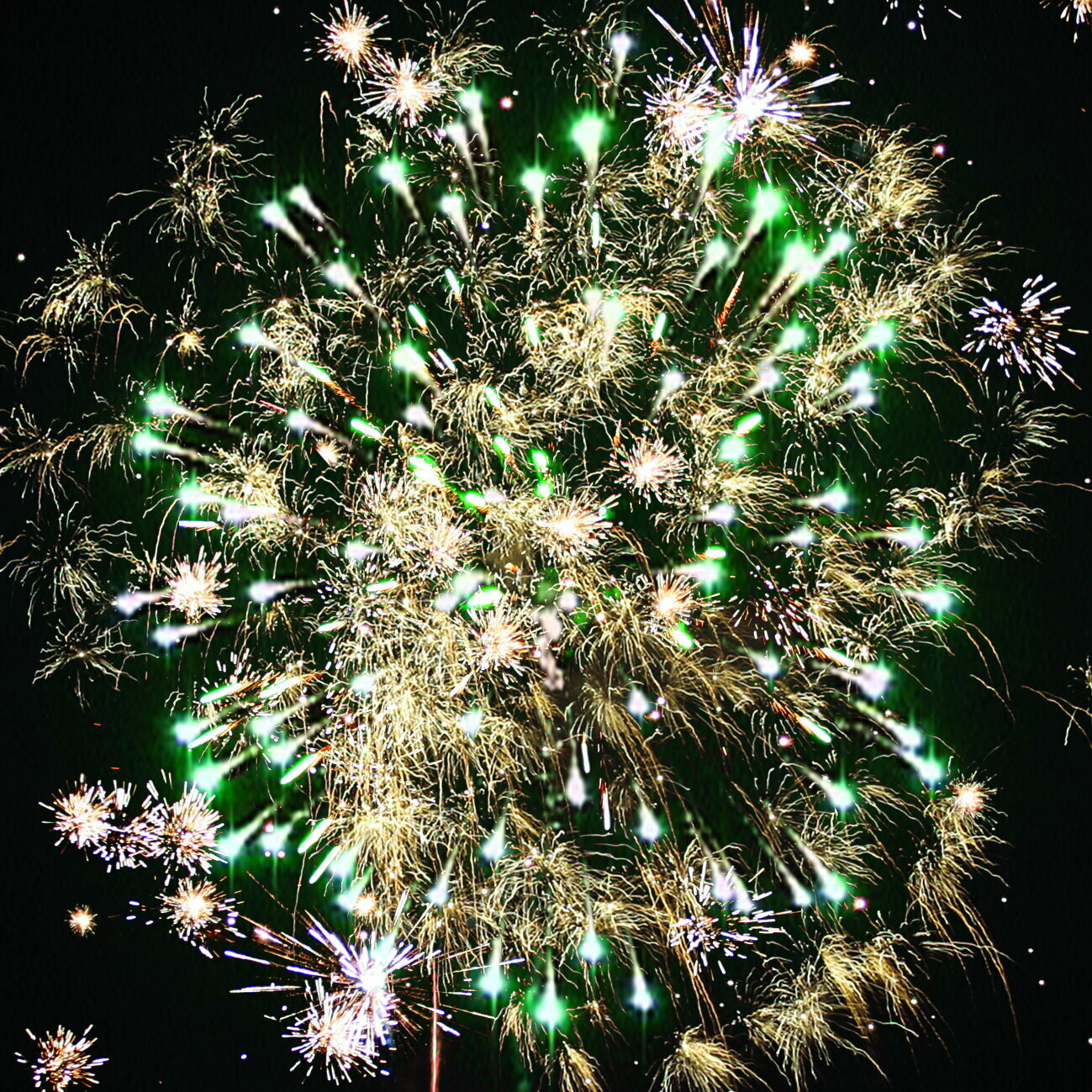| Эффекты | разноцветные кометы разрываются сферами из красных огней с форсами и множества трещащих сфер; зеленых огней с форсами и множества трещащих сфер; серебряных форсов и множества трещащих сфер; золотых форсов и серебряных трещащих огней (залпы) |