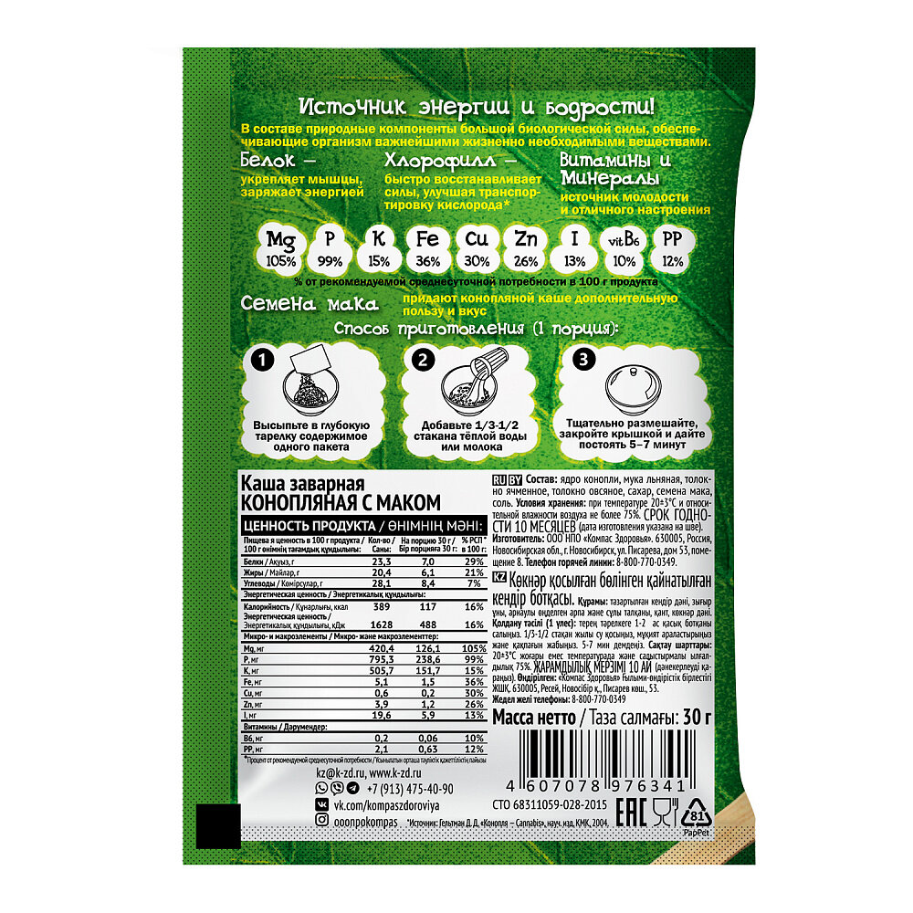 СохранитьКаша конопляная с маком пакетик, Компас здоровья, (в коробке 10 шт по 30 гр) интересное: