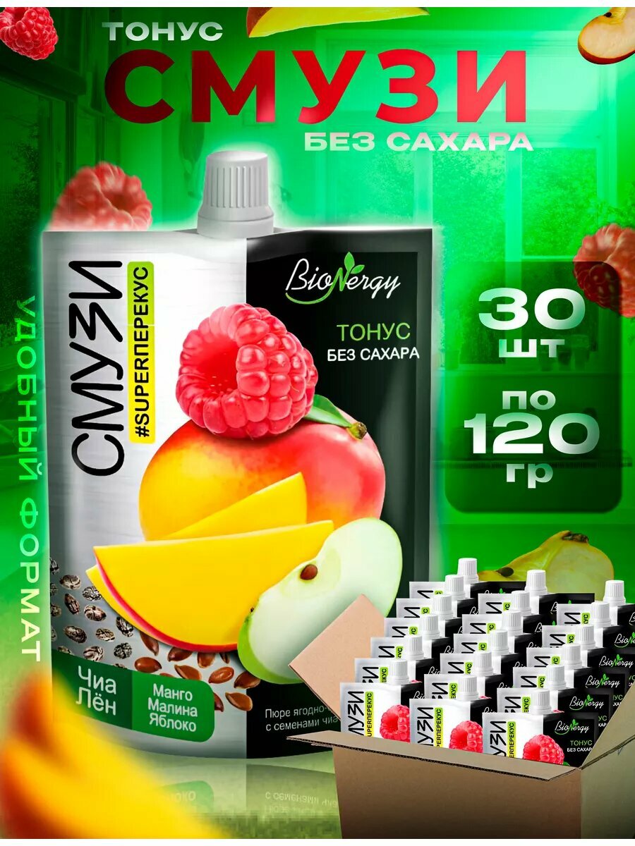 Смузи Тонус без сахара Чиа, лен (манго, малина, яблоко) BioNergy, 10 шт по 120 г