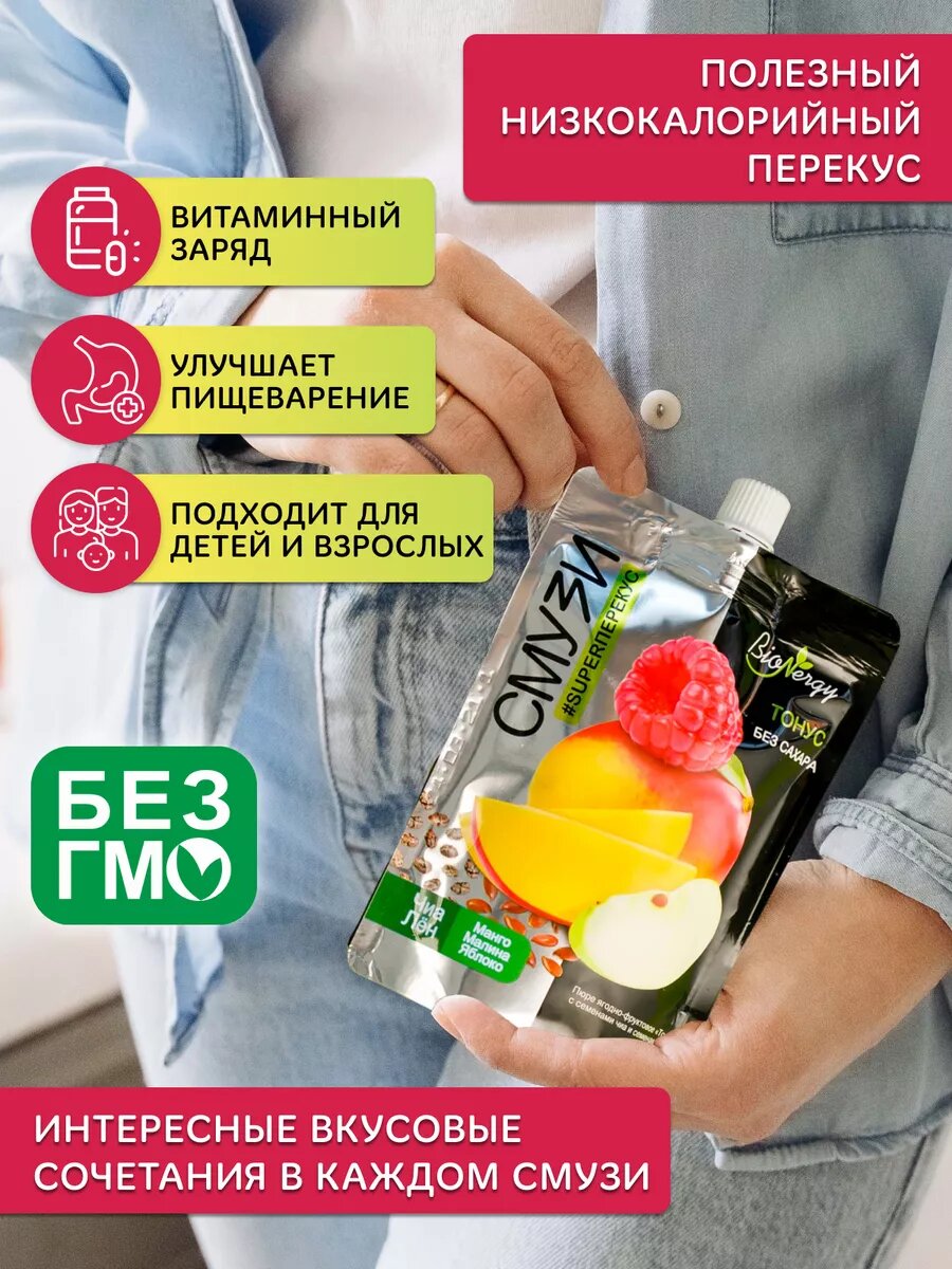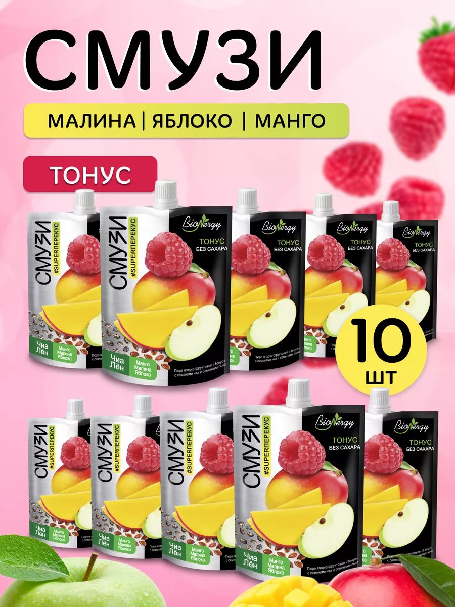 Смузи Тонус без сахара Чиа, лен (манго, малина, яблоко) BioNergy, 10 шт по 120 г