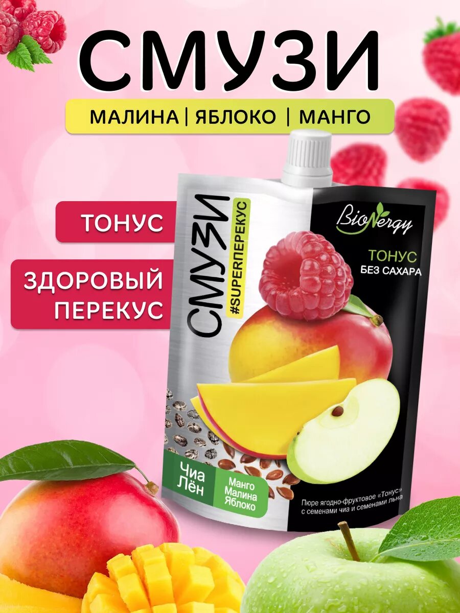 Смузи Тонус без сахара Чиа, лен (манго, малина, яблоко) BioNergy, 10 шт по 120 г