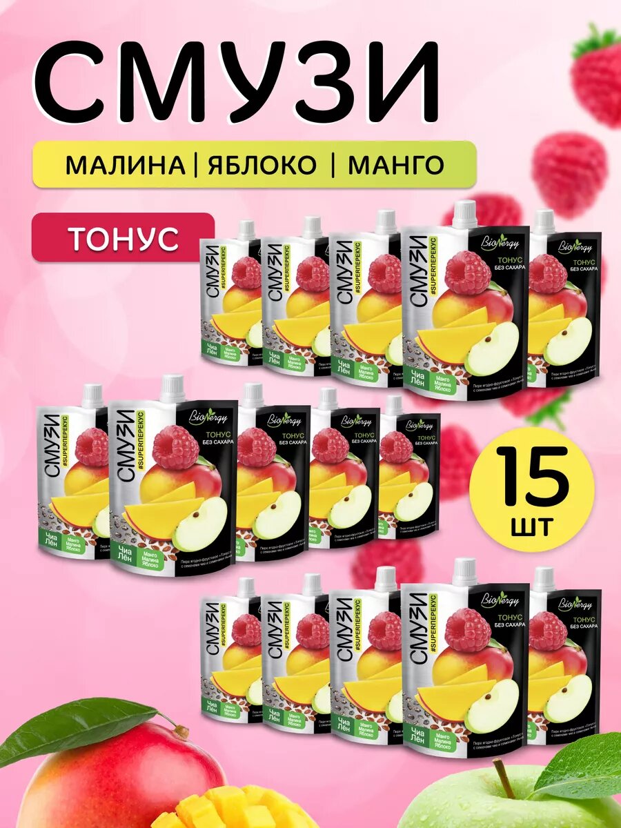 Смузи Тонус без сахара Чиа, лен (манго, малина, яблоко) BioNergy, 10 шт по 120 г
