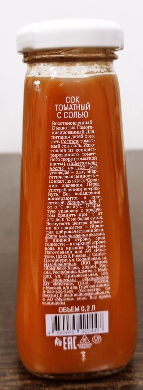 | Состав | Томатный сок, соль поваренная пищевая. Изготовлен из концентрированного томатного пюре. |