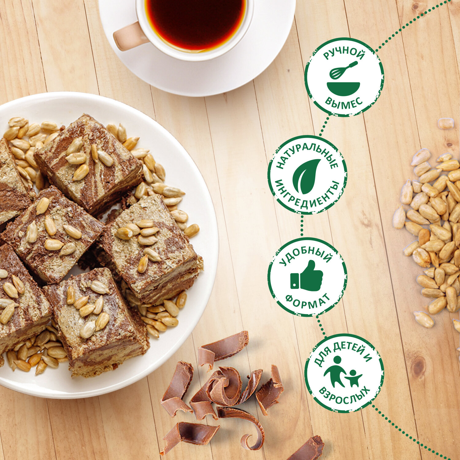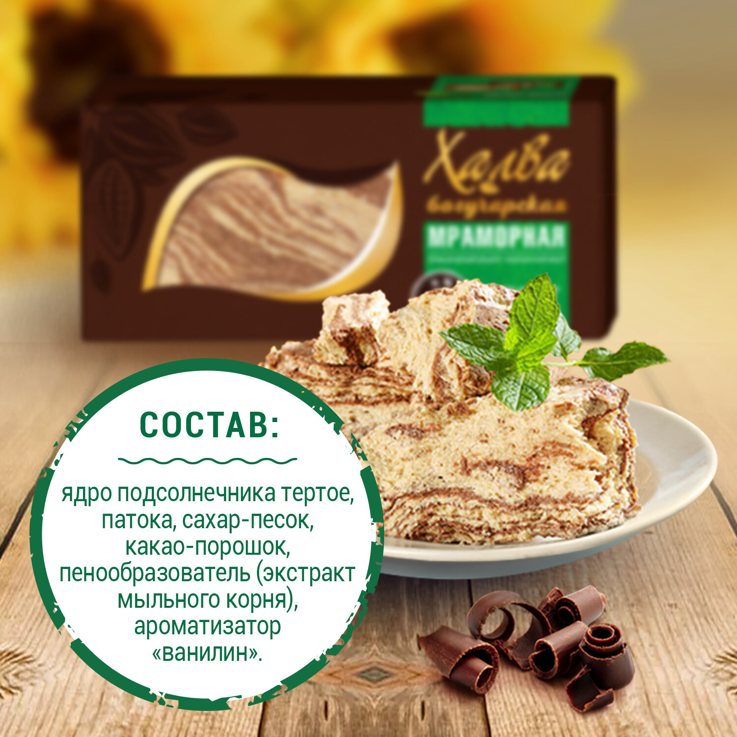 | Состав | ядро подсолнечника тертое, патока, сахар-песок, какао-порошок, пенообразователь-экстракт мыльного корня, ароматизатор «ванилин» |