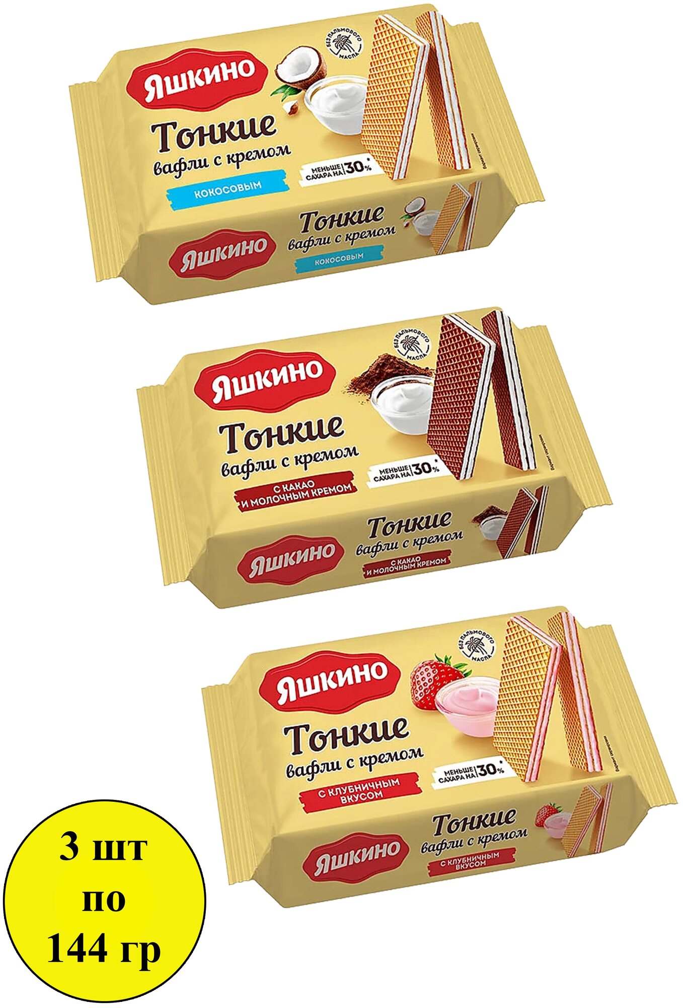 Купить Вафли KDV Яшкино тонкие с какао и молочным кремом + с клубничным вкусом + кокосовым кремом, 3 шт по 144 г