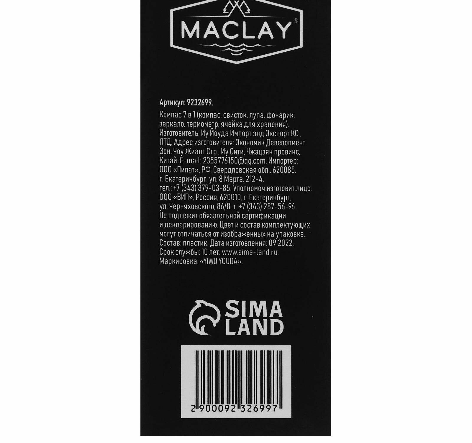 Компас 7 в 1 Maclay: компас, свисток, лупа, фонарик, зеркало, термометр, ячейка для хранения интересное: