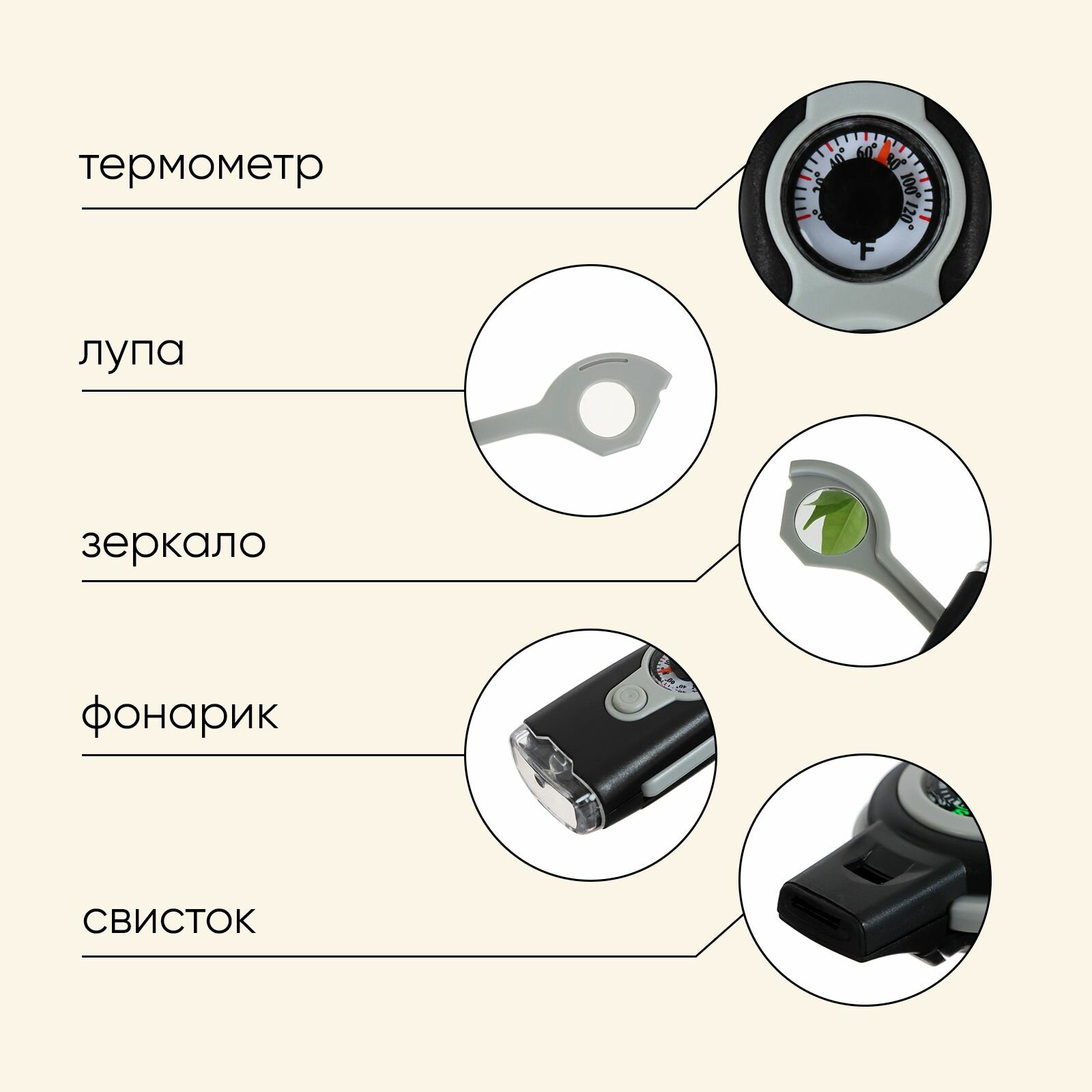 | Дополнительная информация | Компас оснащён дополнительным оборудованием: зеркалом, свистком, лупой, фонариком, термометром, ячейкой для хранения. |