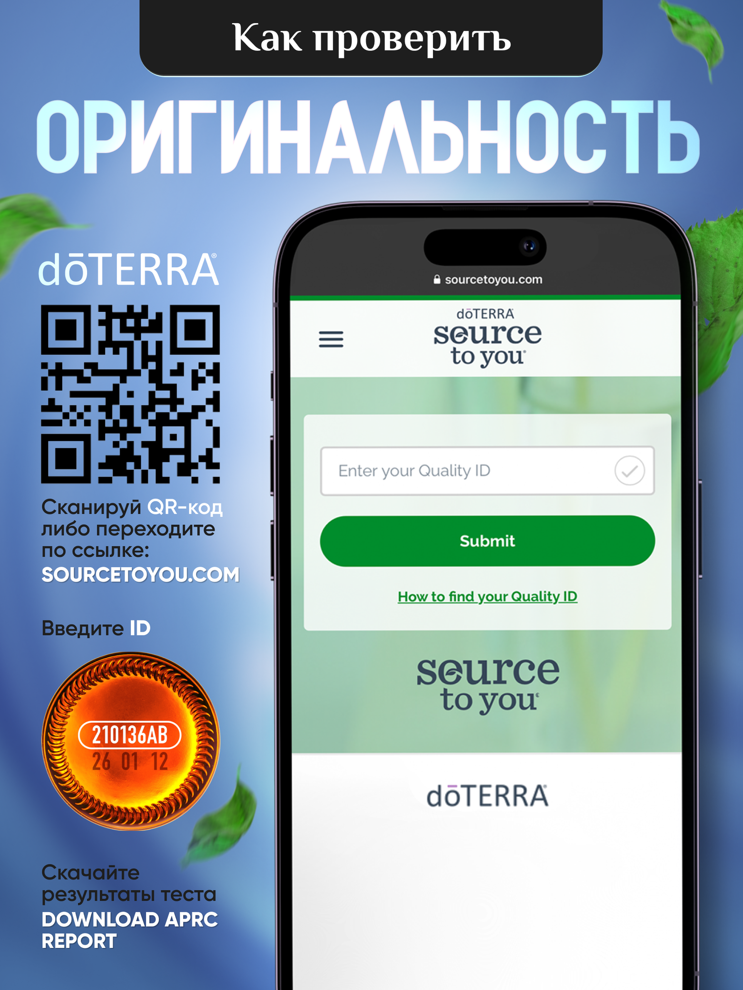 | Способ применения | распыление: Добавьте три-четыре капли масла в диффузор на ваш выбор. Внутреннее применение: Растворите 1 каплю в 120 мл жидкости. Наружное применение: Разбавьте одну-две капли масла во фракционированном кокосовом масле dōTERRA, затем нанесите на выбранный участок кожи |