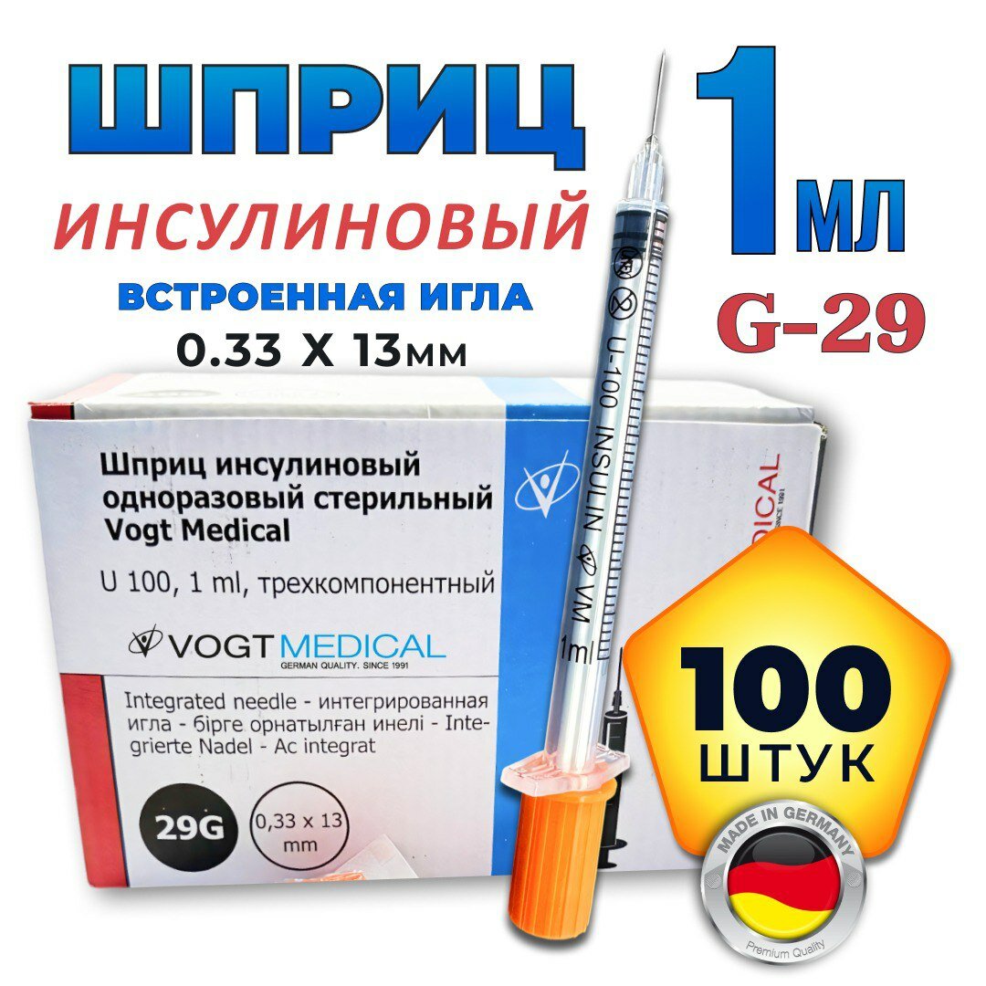 Инсулиновый шприц 1 мл с интегрированной иглой U100 29G 0,33 x 13 мм, Vogt Medical, Германия, 100 штук