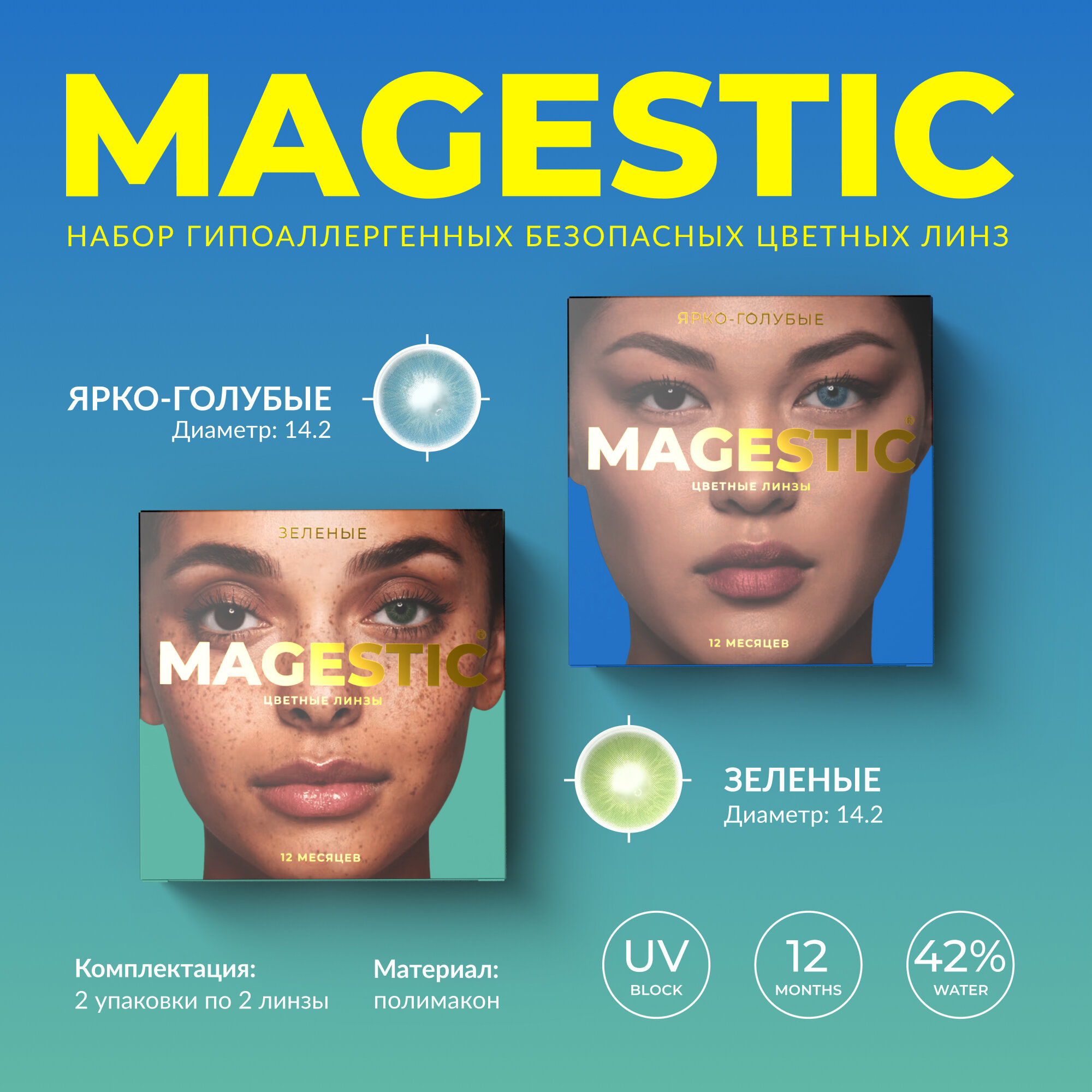 Цветные зеленые + ярко-голубые контактные линзы для глаз MAGESTIC 2 пары, 12 месяцев, 0.00, диаметр 14,2 мм, кривизна 8,6 мм