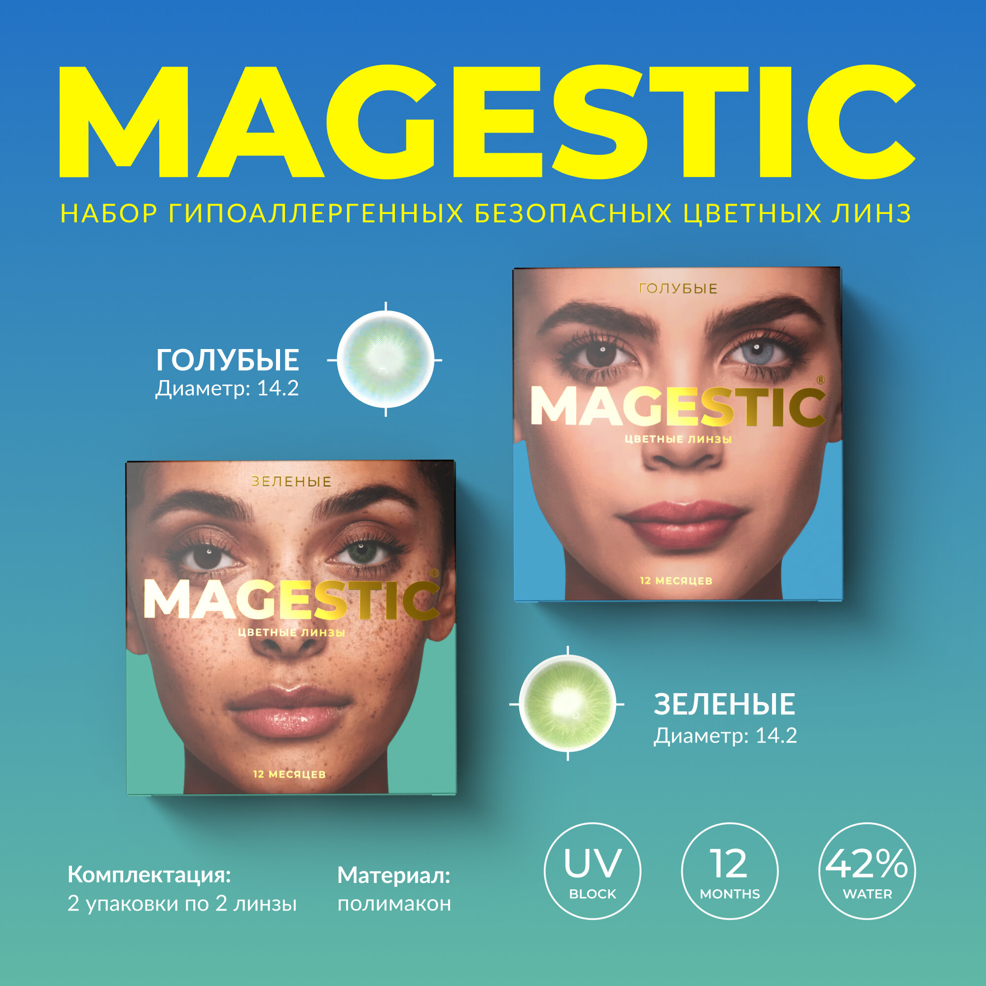 Цветные зеленые + голубые контактные линзы для глаз MAGESTIC 2 пары, 12 месяцев, 0.00, диаметр 14,2 мм, кривизна 8,6 мм