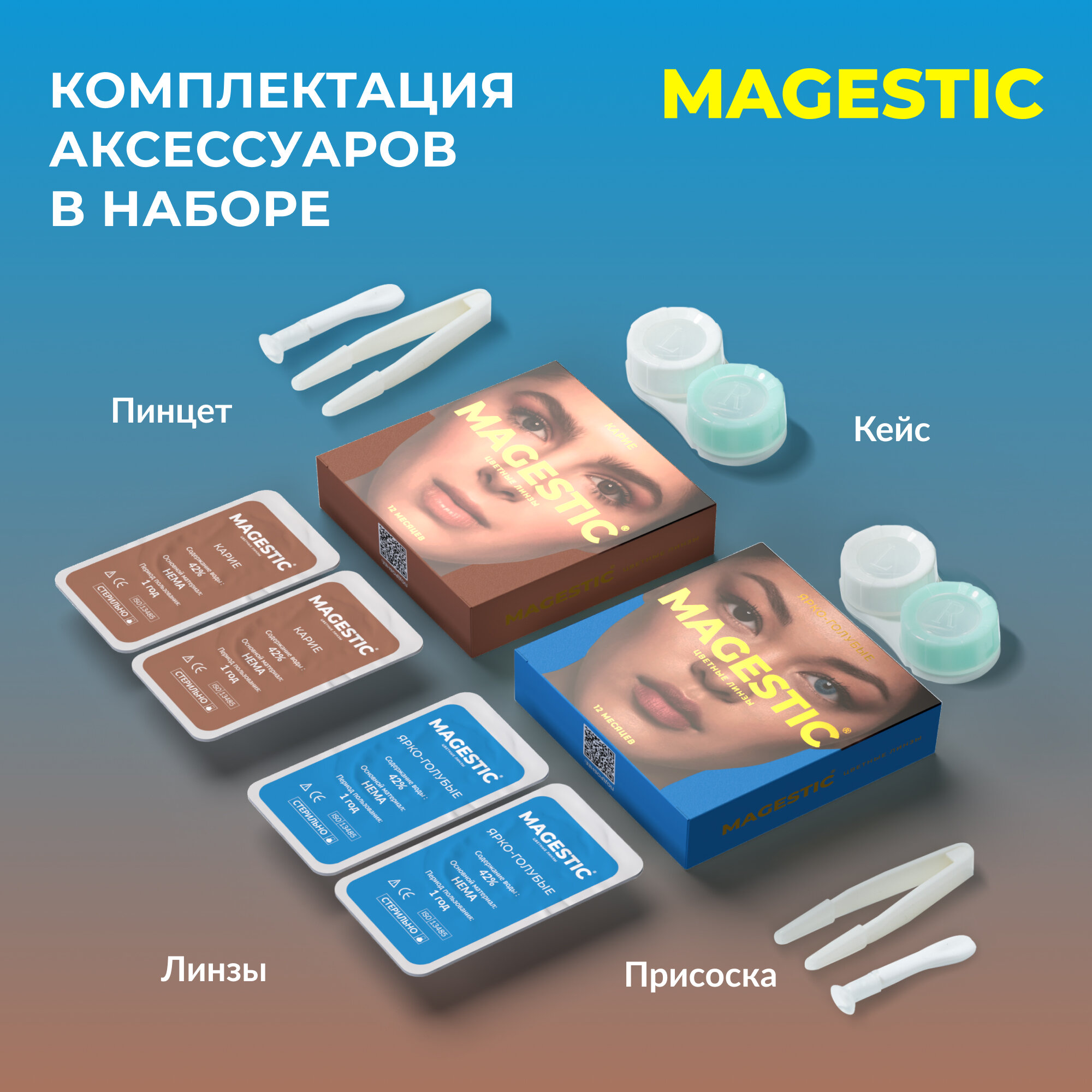 Цветные серо-голубые + карие контактные линзы для глаз MAGESTIC 2 пары, 12 месяцев, 0.00, кривизна 8,6 мм