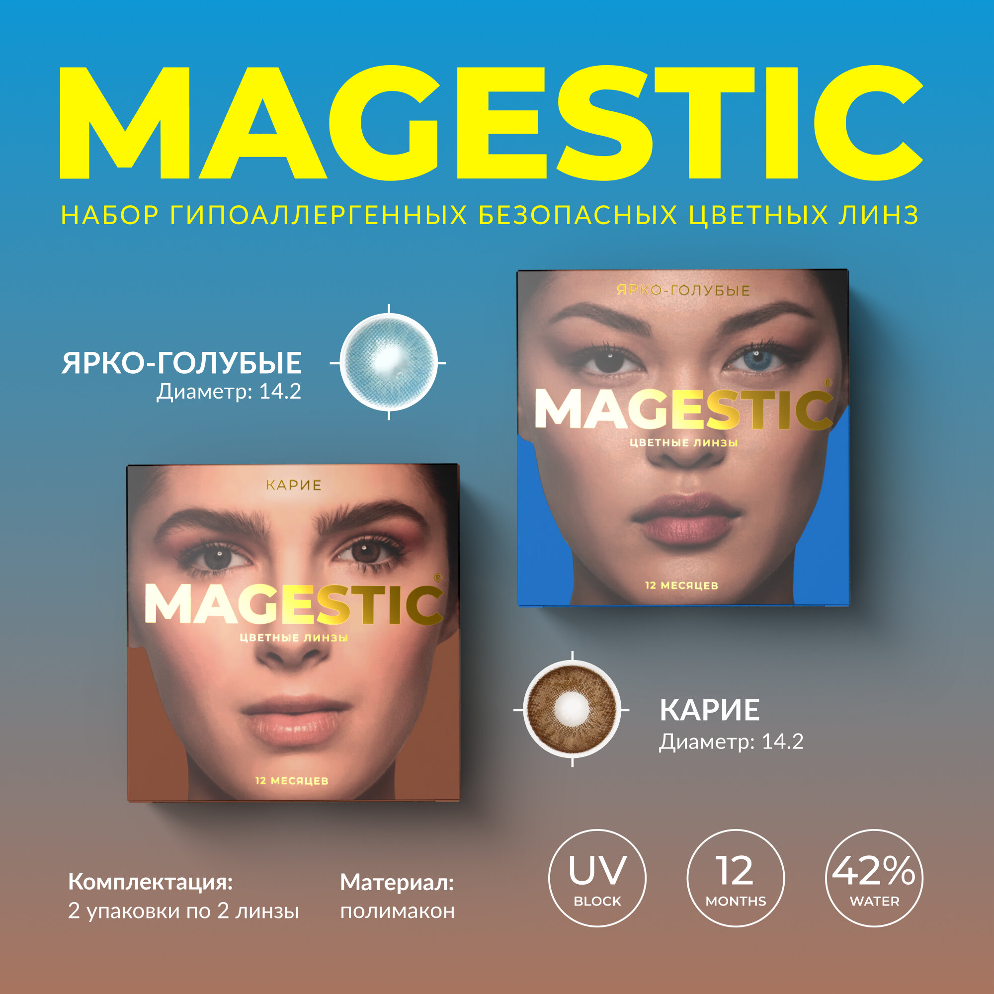 Цветные карие + голубые контактные линзы для глаз MAGESTIC 2 пары, 12 месяцев, 0.00, диаметр 14,2 мм, кривизна 8,6 мм