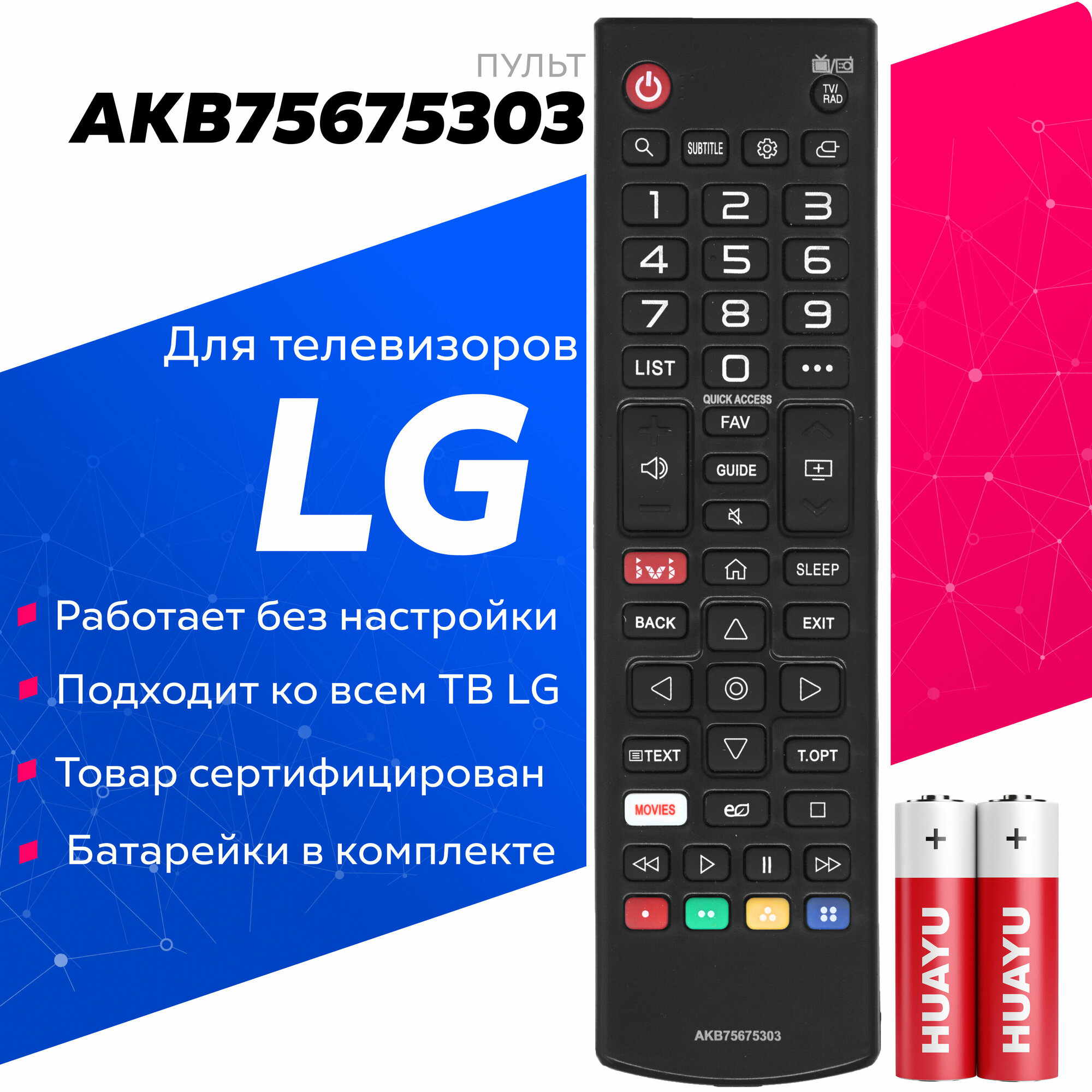 Пульт Huayu AKB75675303 для телевизоров LG с батарейками в комплекте