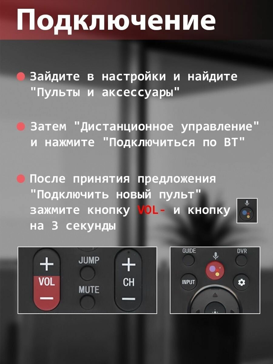 | Дополнительная информация | Для работы пульта необходимо выполнить его подключение (сопряжение) с телевизором. Нажмите кнопку HOME, выберите меню Установки Выберите Голосовое дистанционное управление и нажмите кнопку активации Нажмите и удерживайте VOL- на пульте Продолжая удерживать VOL- нажмите и удерживайте кнопку микрофона на 3 секунды В некоторых версиях Android обозначения могут отличаться. Обратитесь к инструкции вашего ТВ за подробным описанием. |