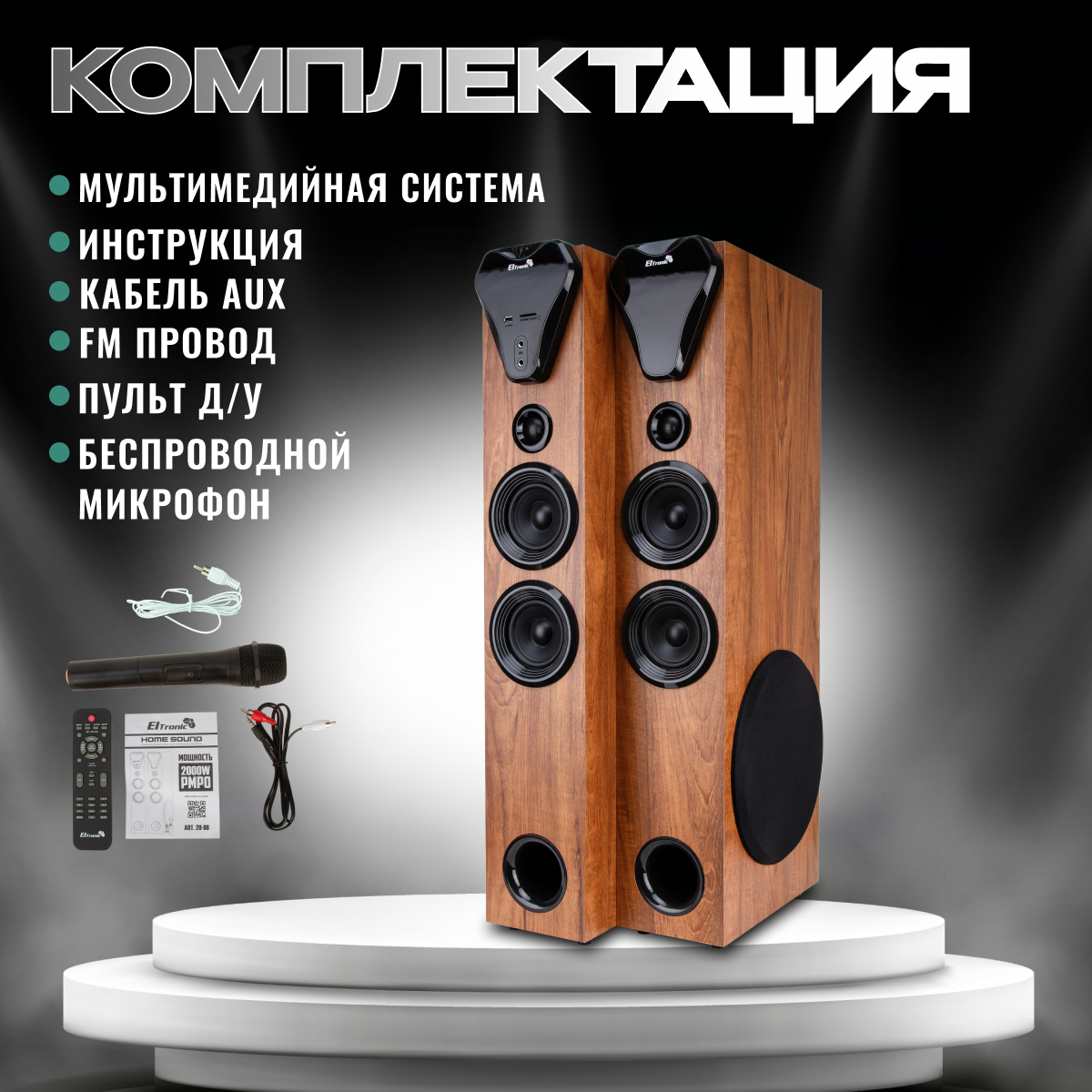 | Комплектация | Акустическая система (2шт) - Микрофон беспроводной 1 шт. - Пульт Д/У - Инструкция |