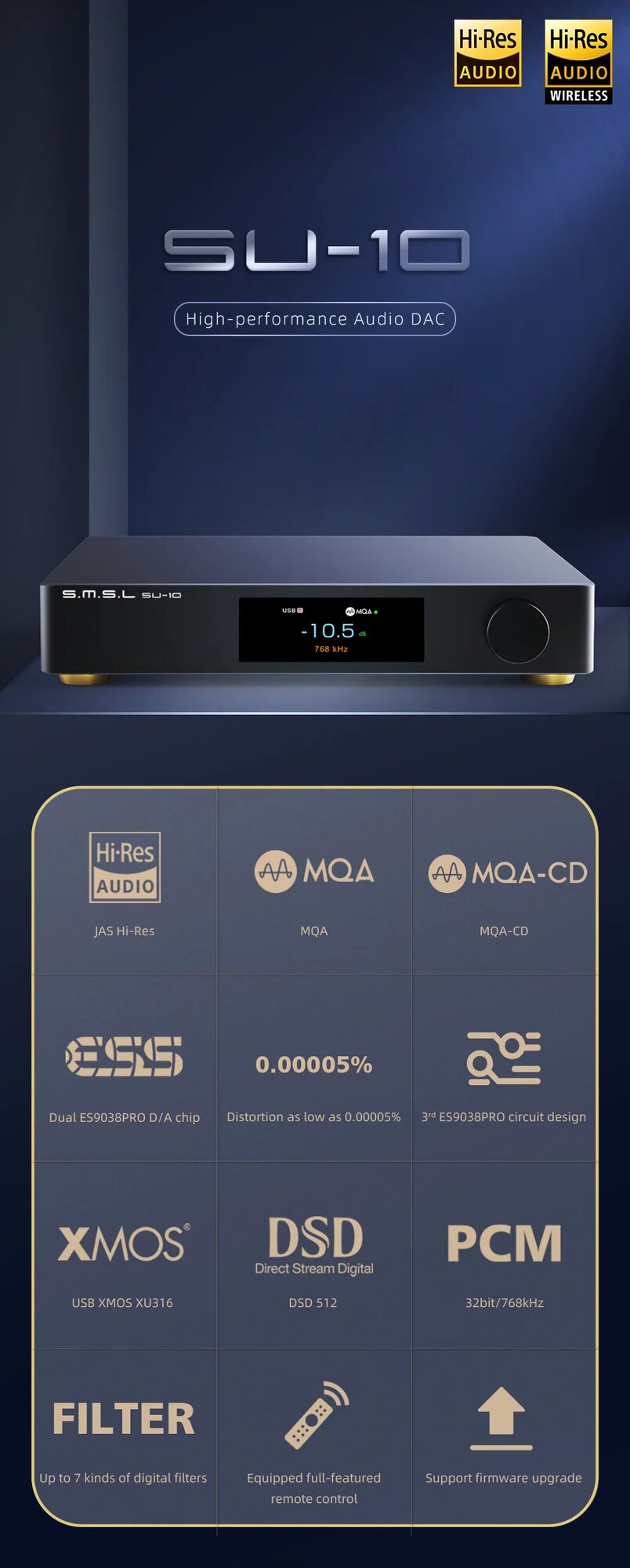 SMSL SU-10 MQA декодер поддержка MQA-CD Dual ES9038PRO XMOS316 DAC 32Bit/768kHz DSD512 поддержка LDAC,Aptx/HD,SBC,AAC SMSL SU10 DAC, SU-10 интересное: