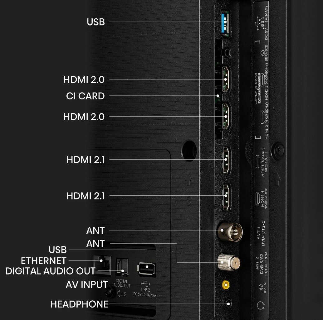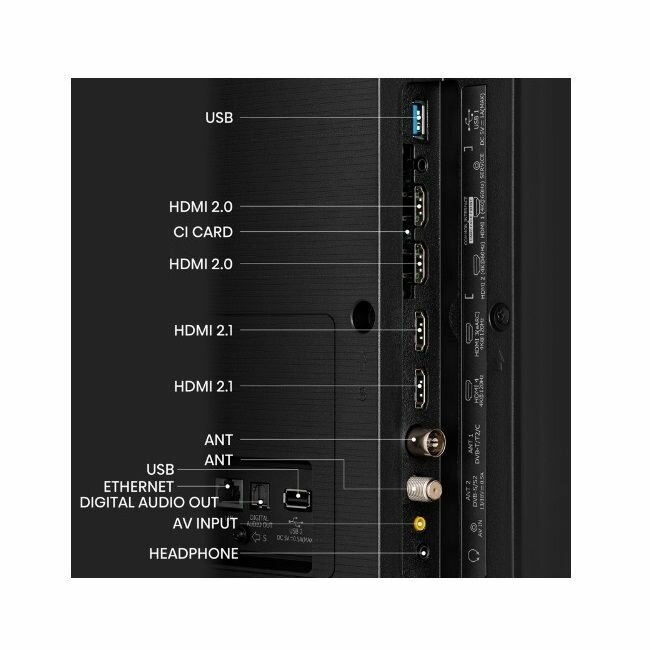 | Дополнительная информация | Процессор: 4-ядерный MT9618 Wi-Fi: IEEE 802.11 a/b/g/n/ac/ax (2.4G 5G and 6G) Bluetooth: версии 5.1 Интернет браузер: Odin с HbbTV 2.0.3 Частота экрана: 120 Гц (исходная) / 144 Гц (VRR) |