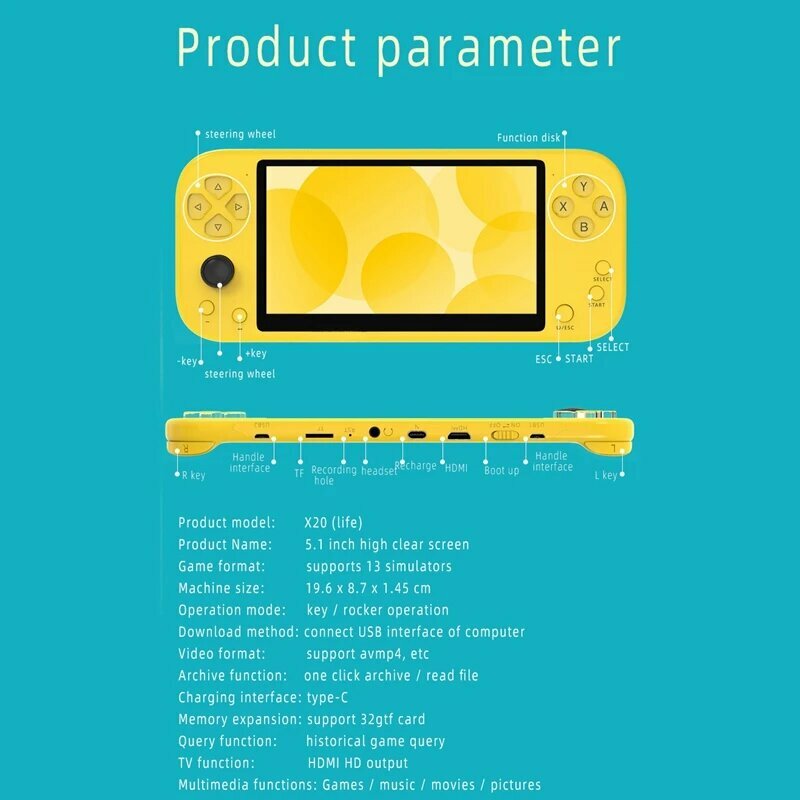 X20 Ретро видео игровая консоль 5,1 дюймовый дисплей Карманные игровые консоли 64-битный игровой плеер