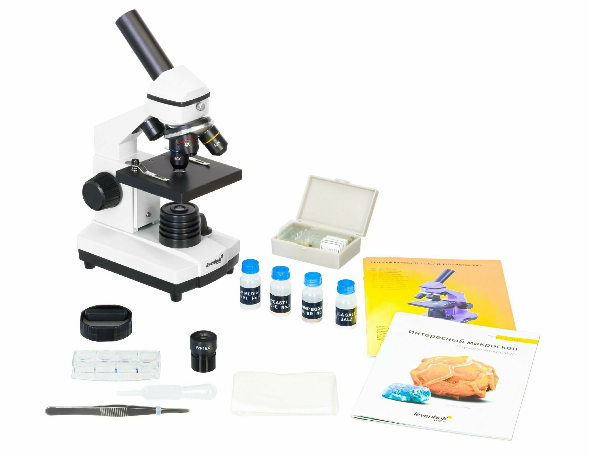 | Подробная комплектация | Микроскоп Объективы: 4х, 10х и 40хs Окуляр: WF16x Предметный столик с зажимами Диск с диафрагмами Конденсор Встроенные нижний и верхний осветители на светодиодах Сетевой адаптер (питание 220 В, 50 Гц) Набор для опытов Levenhuk K50 Инструкция по эксплуатации и гарантийный талон Набор для опытов Levenhuk K50: Руководство «Интересный микроскоп. Изучаем микромир» Пинцет Инкубатор для артемии Микротом Флакон с дрожжами Флакон со смолой для изготовления препаратов Флакон с морской солью Флакон с артемией (морским рачком) 5 готовых образцов и 5 чистых предметных стекол Пипетка Пылезащитный чехол |