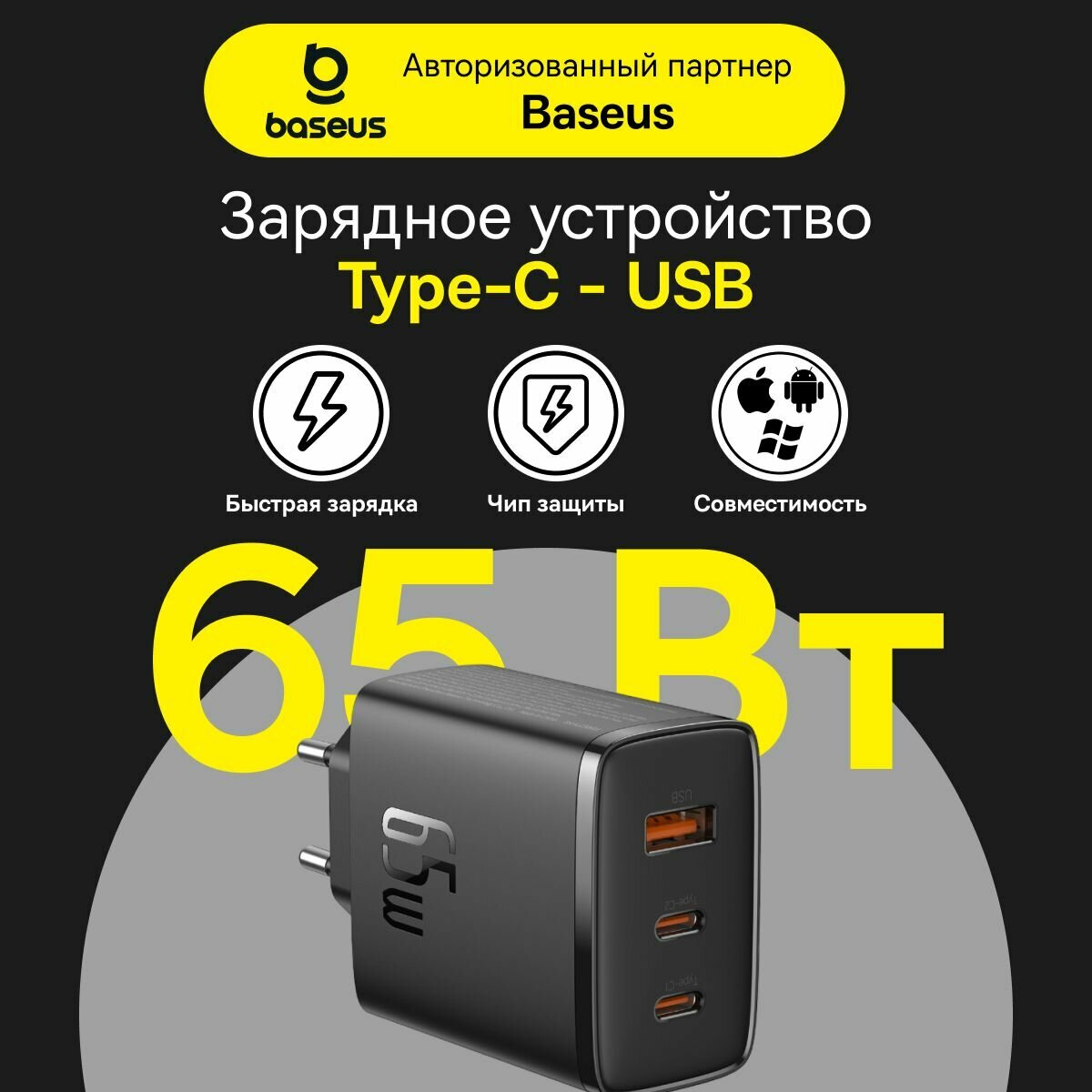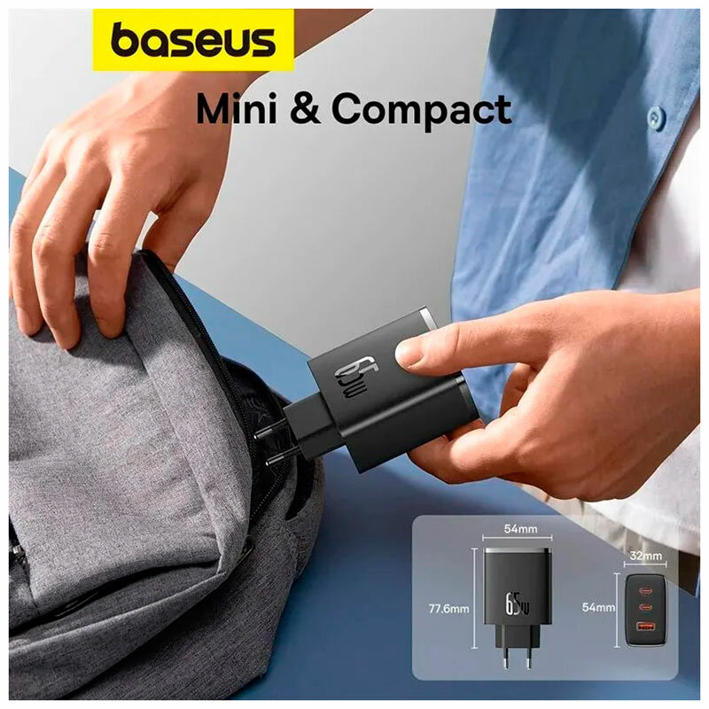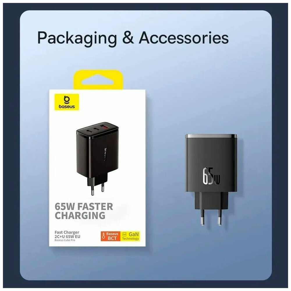 | Подробная комплектация | Сетевое зарядное устройство Baseus GaN 5 65W Cube Pro, фирменная упаковка Baseus |