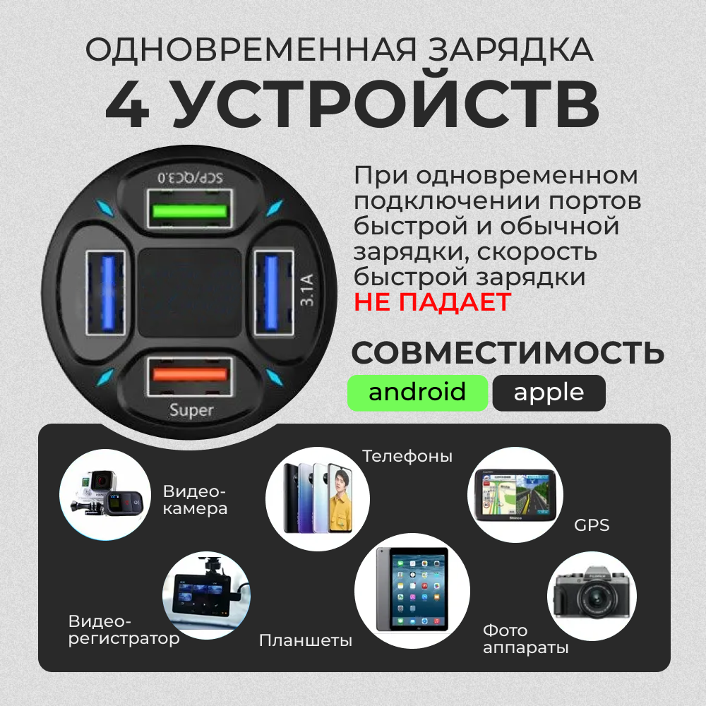 СохранитьАвтомобильное зарядное устройство для телефона на 4 порта, 7А, быстрая зарядка в прикуриватель, QC3.0, 4USB разъема, блок питания черный интересное: