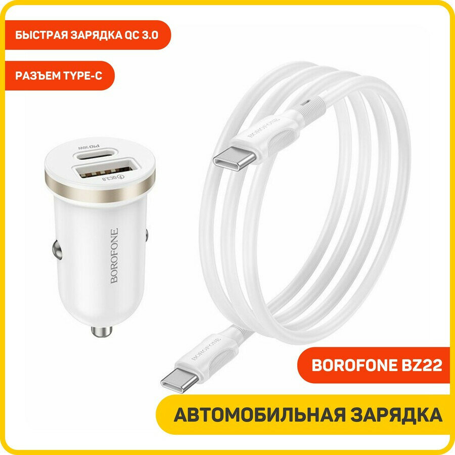 Автомобильная зарядка для телефона, BOROFONE, BZ22, с быстрым зарядом, USB+Type-C разъемы, 30W, автозарядка в машину в прикуриватель, белый