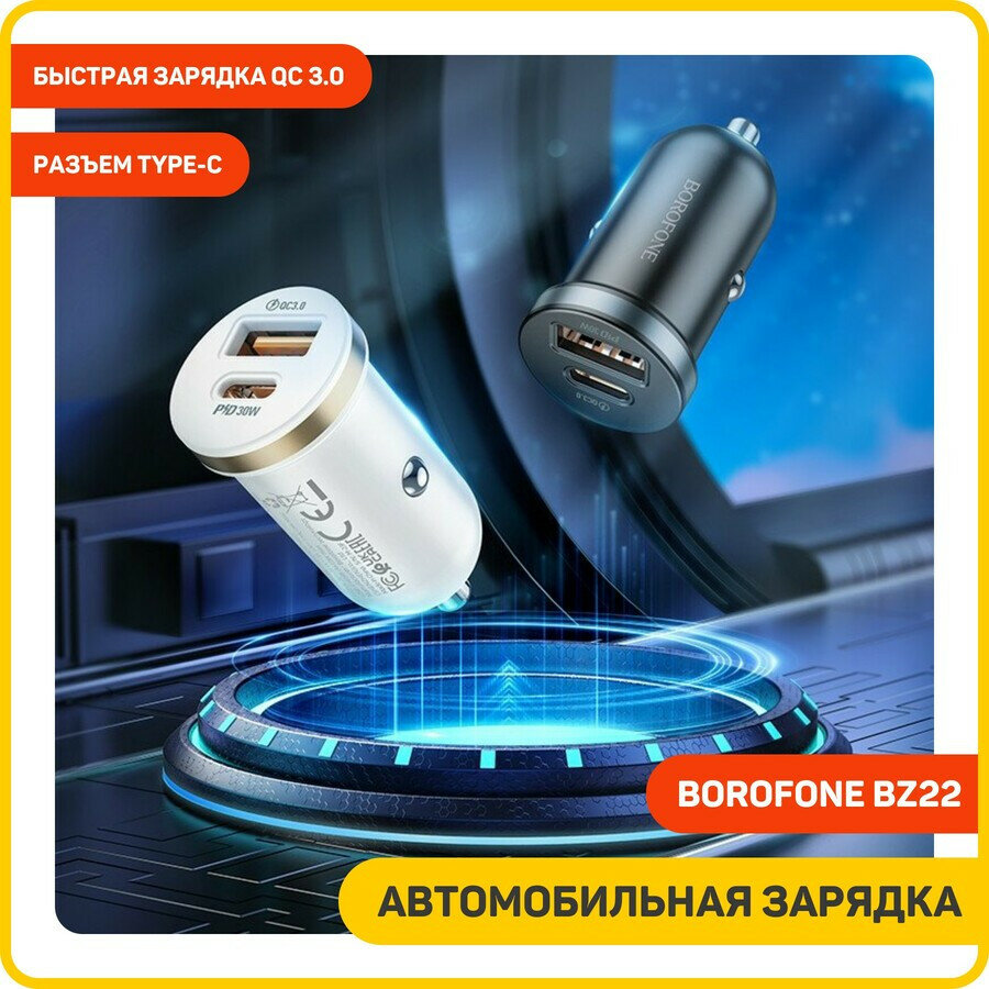 Автомобильная зарядка для телефона, BOROFONE, BZ22, с быстрым зарядом, USB+Type-C разъемы, 30W, автозарядка в машину в прикуриватель, чёрный