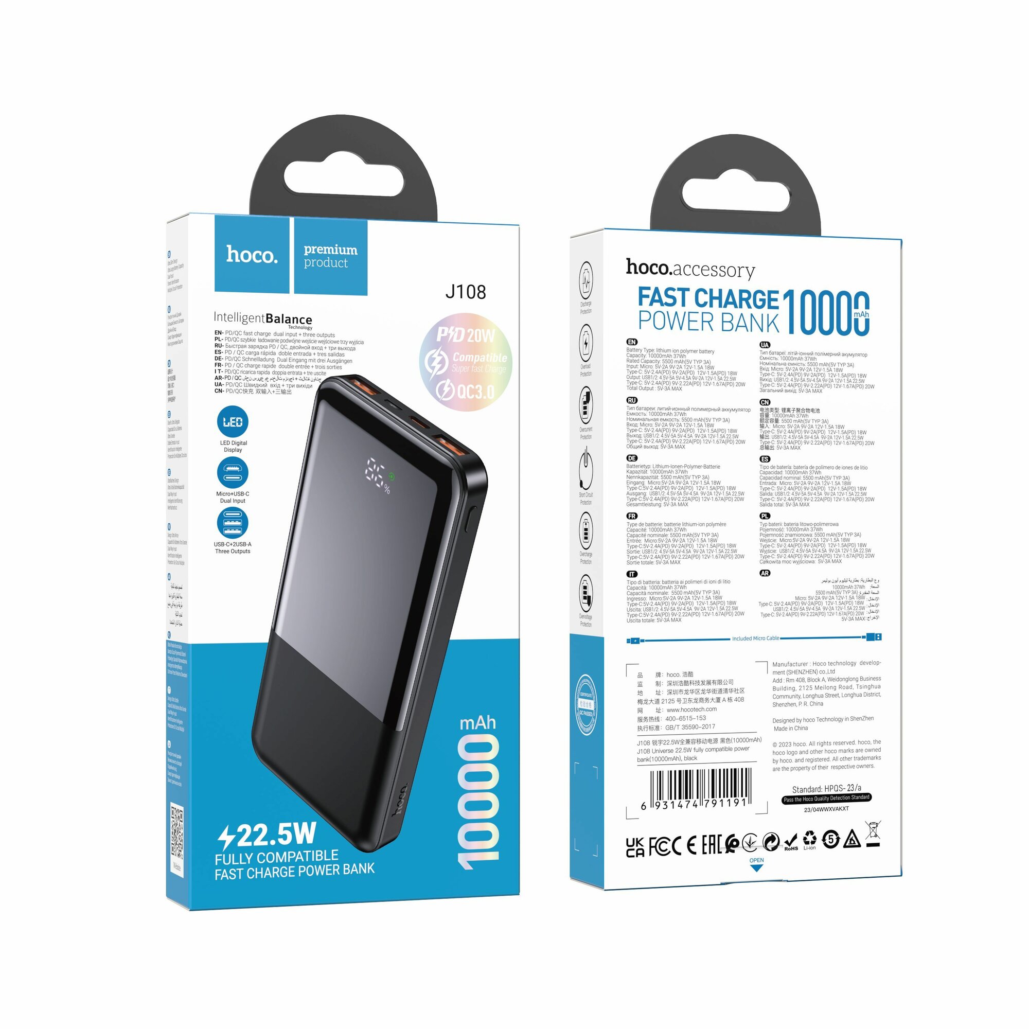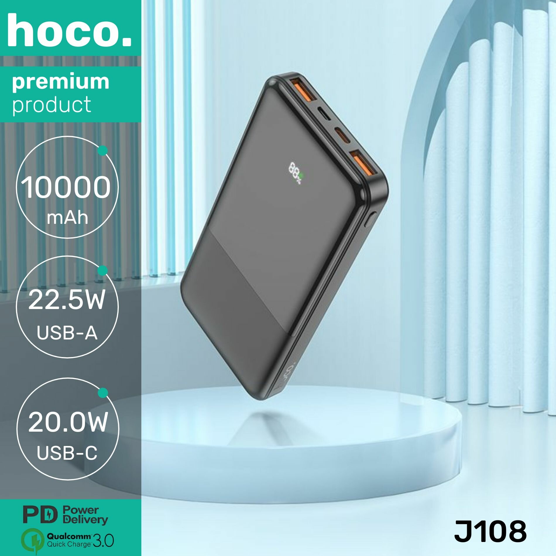 Универсальный Доп. Аккумулятор 10000mAh, J108, HOCO, выход: 1 USB (22.5W)+1 PD (18W), белый